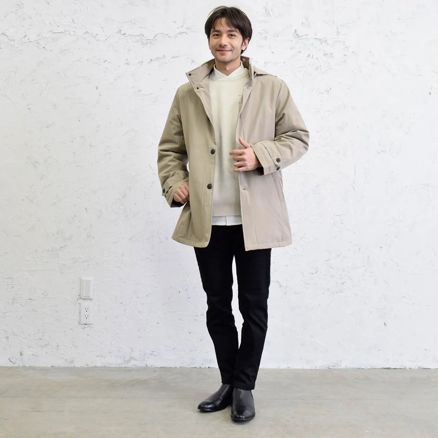 ボタンを留めるか、開けて羽織るかの違いですが、与える印象は全然違いますね。