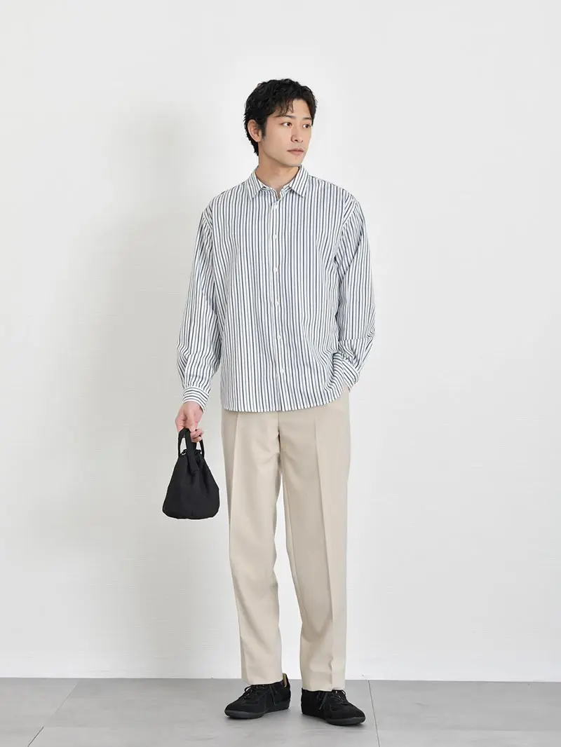 タックワイドスラックスにプルオーバードレスシャツを組み合わせた、20代後半メンズにおすすめのファッション。