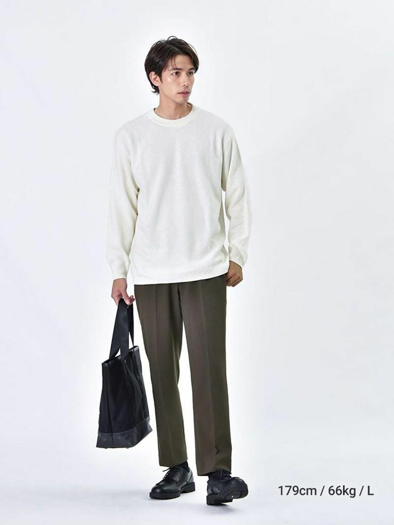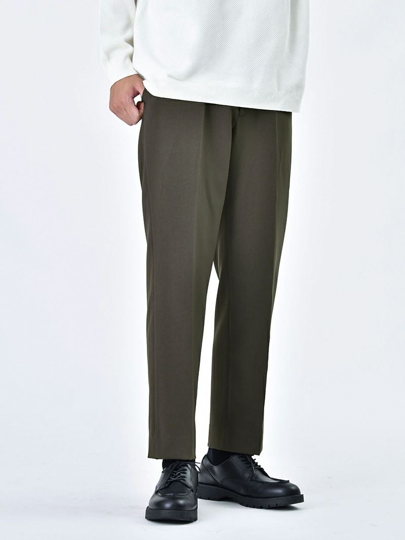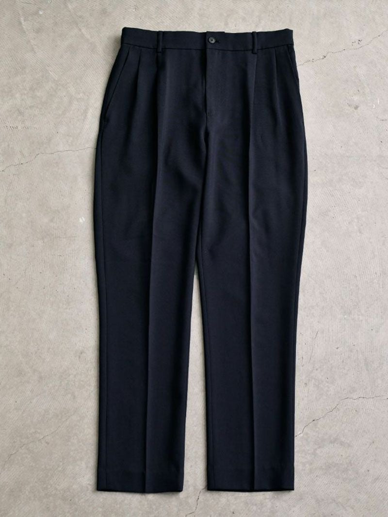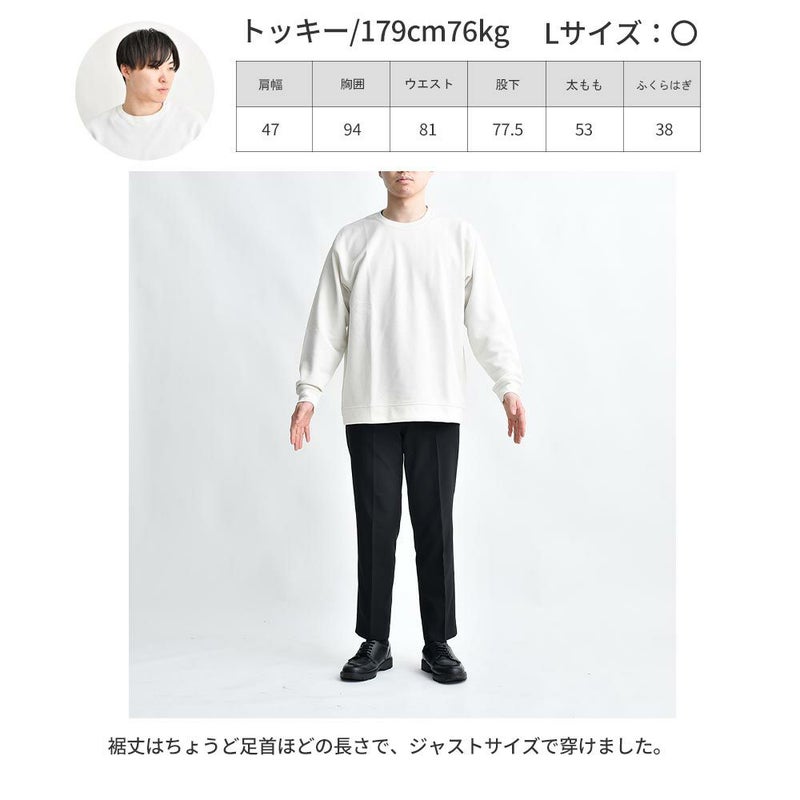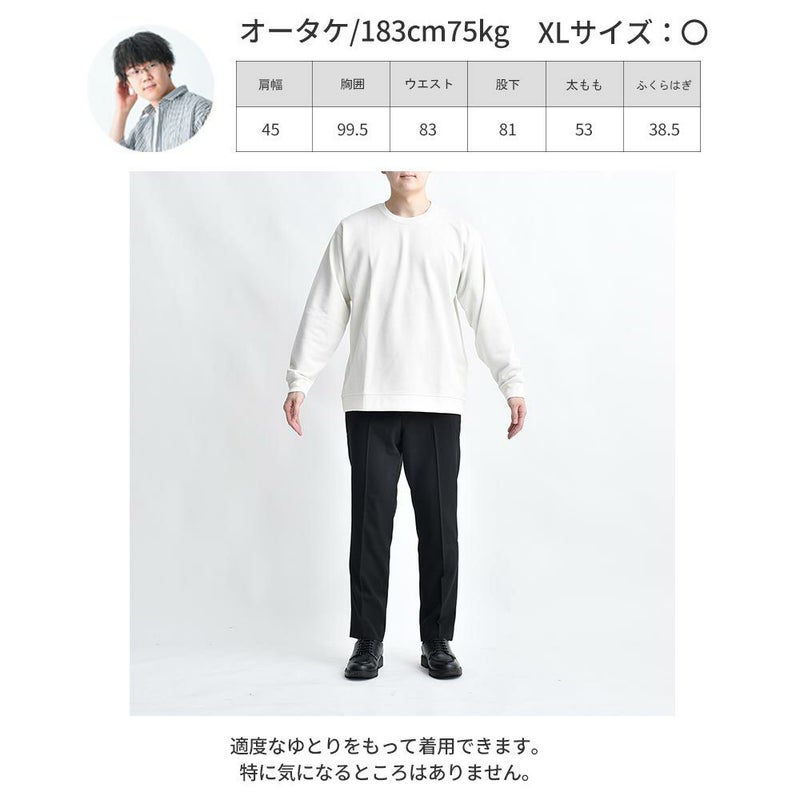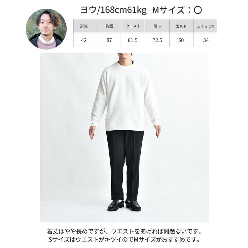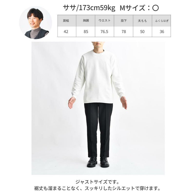 ON/OFF使える万能パンツ 2タック 2タックにすることでトレンド感のある、ドレスライクな大人のオシャレに最適なパンツとなっています。シュッとした好印象シルエットを保ちながら、ヒップ・太ももにゆとりが生まれるので体型カバー効果もあります。 もっと見る タックなし タックなしのモデルは足首まですっきりとしたデザインになっています。シュッとしたスリムシルエットがお好きな方におすすめです。 機能性とデザイン性を両立 ストレッチの効いた生地で、一日中快適な着心地です。 自宅の洗濯機で洗いたい時にすぐに洗えるのでクリーニングに出す手間もかかりません。また、イージーケアで洗濯後もシワになりにくく、乾いたあともアイロン不要です。 いろんなシーンに対応可能 スニーカーを合わせれば日常着やデート、革靴を合わせればオフィスシーンにも対応可能。 専用のベルト バックルまでブラックに仕上げたこちらのベルトは、黒系パンツと合わせやすいようにデザインしました。バックルの主張が抑えられるので、シンプルな着こなしに仕上がります。 一緒におすすめ リアルレザーベルト CHECK サイズ・素材 タックなし ウエスト 股上 股下 ヒップ もも幅 すそ幅 XS 70~76 26 66 - 30 17.5 S 74~80 26.5 67 - 30.5 18 M 78~84 27 69 103 31 19 L 82~88 27.5 71.5 104 31.5 19.5 XL 85~91 28 73 - 33 20 タックあり ウエスト 股上 股下 ヒップ もも幅 すそ幅 XS 70~76 26 66 96 30 17.5 S 74~80 26.5 67 98 30.5 18 M 78~84 27 69 - 31 19 L 82~88 27.5 71.5 - 31.5 19.5 XL 85~91 28 73 109 33 20 タックあり カラー別 股下 ブラック ネイビー ブラウン XS 65 65 65 S 65.8 66 66 M 69.5 67.5 68 L 73.8 72 71 XL 75.8 76 75 ※表記サイズは実寸であり、個体差により誤差が生じる場合があります。 ※商品によっては洗濯タグにヌード寸法が記載されておりますが、実寸とは異なります。 伸縮性 あり ややあり なし 厚み 厚手 普通 薄手 透け感 あり ややあり なし 洗濯 洗濯OK ネット使用 手洗いのみ 表地 ポリエステル100% 裏地 なし 生産国 中国 表示を隠す サイズにお悩みですか? AIに適正サイズを聞く 返品・交換は無料で安心 ご自宅でじっくりご試着いただけます。合わなければ送料負担なく返品できます。あなたにぴったりの一着と出会えるよう、お手伝いいたします。 コーディネート ブラック着用 ヘビーウェイトクルーネックTシャツ CHECK ブラック着用 コンフォートテーラードジャケット CHECK バーズアイライトサマーニット CHECK リアルレザーベルト CHECK ネイビー着用 オックスフォードボタンダウンシャツ CHECK ポリコットンドレストレーナー CHECK スクエアキャンバススリッポン CHECK ネイビー着用 コンフォートテーラードジャケット CHECK ヘビーウェイトクルーネックTシャツ CHECK ネイビー着用 LIQUID ニット カルゼ編み CHECK Salvatole Marra クロノグラフ腕時計 CHECK クラシックレザーUチップシューズ CHECK ネイビー着用 コンフォートテーラードジャケット CHECK Salvatole Marra クロノグラフ腕時計 CHECK スタッフコーディネート もっと見る