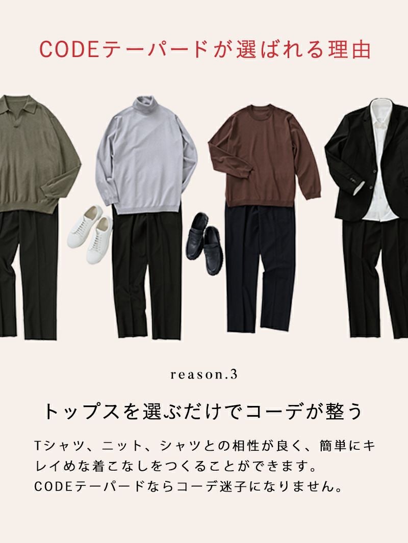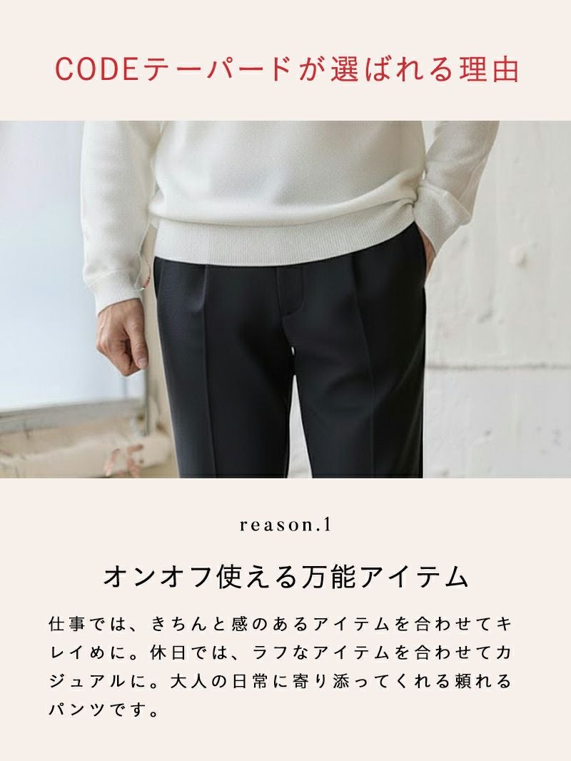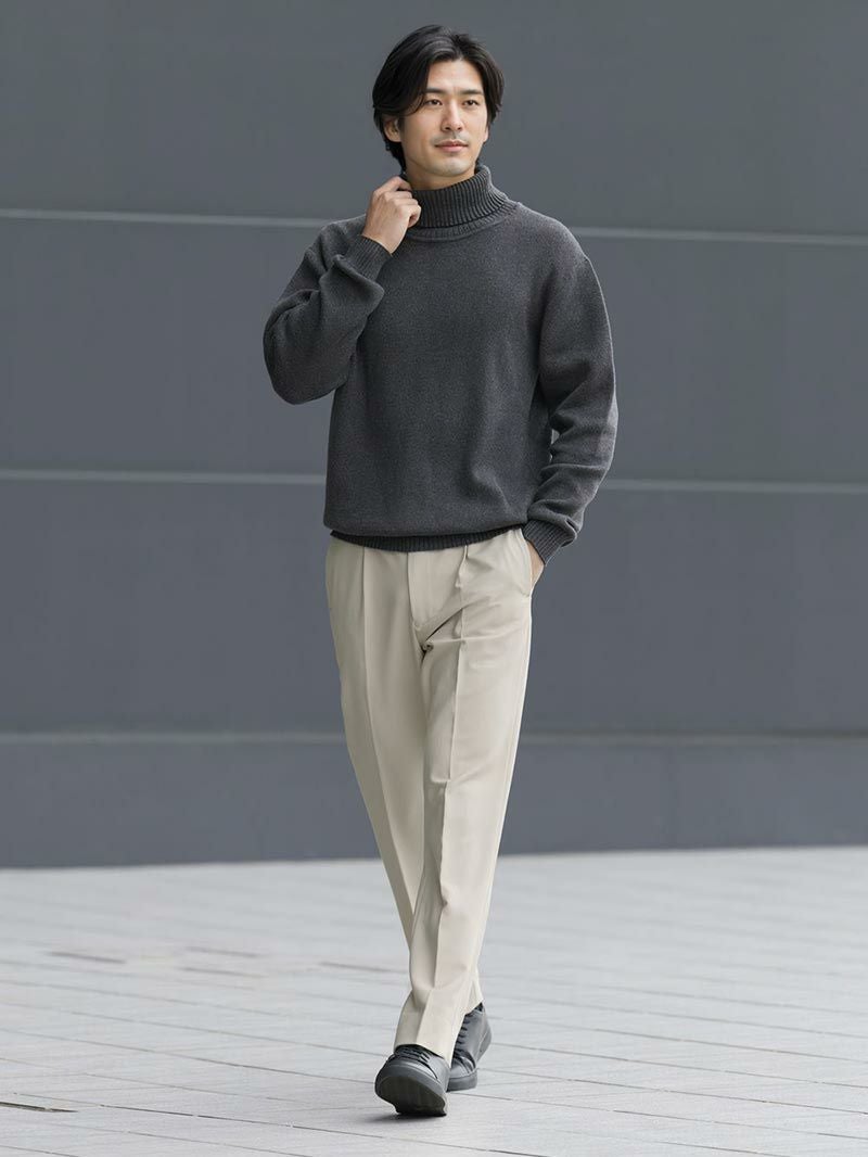 生地、フィット感、胴回り、太腿回り、股下どれをとってもパーフェクト。また履いていて疲れない。屈んだ時の膝やお尻ラインも自然である。様々な服への合わせ方が自由でかなり決まる。魅せることのできるパンツ。