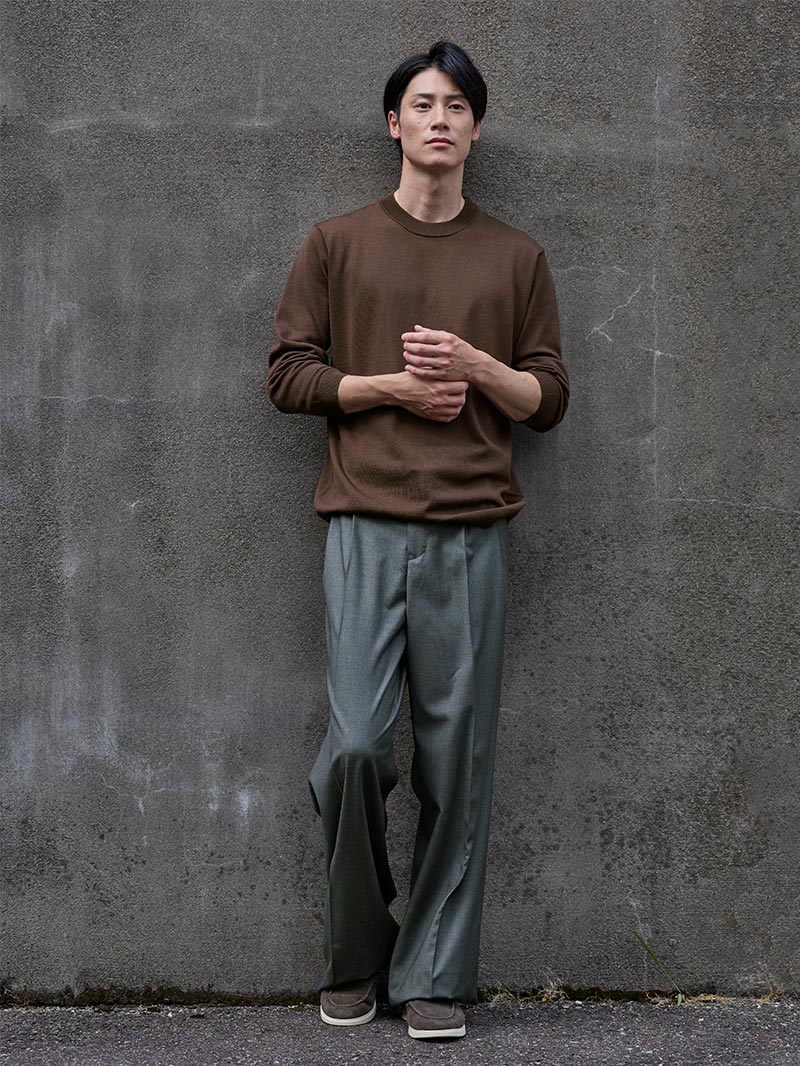 コーヒーブラウンのニットにグレーのパンツを合わせたシンプルコーデ。