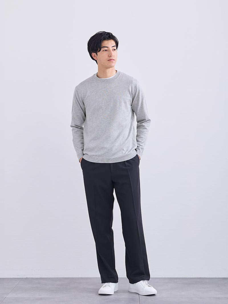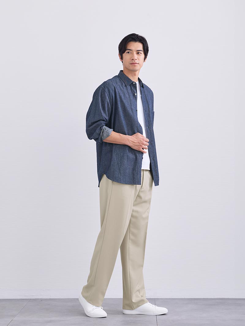 アイテム説明 大人キレカジコーデの味方好印象ストレートパンツ CODEストレートの おすすめポイント 01. 失敗しない美ストレートライン 美しいストレートラインが、すっきりとした印象を演出。 日本人の体型にフィットするよう改良を重ねたパターンだから、どんな体型の方でも自然にスタイルアップが叶います。 02. 細すぎず太すぎない適度なゆとりで着回し自在 細すぎず太すぎない適度なゆとりのあるシルエットだから、トップスを選ばず着こなしの幅が広がります。 きちんと見せもカジュアルダウンも自在で、オンオフ問わず活躍する頼れる一本です。 03. ストレッチ×ウエストゴムの”ラク穿き仕様” 伸縮性の高いポリウレタンを配合し、快適でストレスフリーな着心地を実現。 ウエストゴムが締めつけを抑え、どんな日でもラクに過ごせる穿き心地です。 ゴム部分のシャーリングはサイドに付けることで後ろから見た時のシルエットも美しく仕上げています。 生地は糸をしっかり交差させたオックス織り。 張り感・厚みがあり、丈夫でオールシーズン対応OKです。 04. シワを気にせず一日中快適な着心地 防シワ素材だから長時間座ってもシワが目立たず、朝から夜まできちんと見えが続きます。 自宅で洗濯機洗い可能、アイロンいらず。手間なくきれいが保てるから、毎日頼れる一本です。 CODEコードパンツ シルエット別ラインナップ CODEパンツは3種類のシルエットを ご用意しております。 あなたの好みや、体型にピッタリの CODEパンツを選んでみませんか? テーパード ストレート ワイド カラー ブラック、ネイビー、アーシーベージュ 価格 7,990 サイズ S, M, L, XL シルエット名 テーパード ストレート ワイド キレイめ ◎ ○ △ カジュアル ○ ◎ ◎ ベーシック重視 ◎ ○ △ トレンド重視 ○ ○ ◎ 脚が太い ○ ◎ ◎ 背が低い ◎ ◎ △ 背が高い ○ ◎ ◎ サイズ・素材 ウエスト 股上 股下 ヒップ もも幅 すそ幅 S 78~86.5 27.5 67.5 104 31.5 22 M 81~90 28 70 108 33 22.5 L 85~93 28.5 71.5 111 34.5 23 XL 88.5~95 29.5 74 114 35 23.5 ※表記サイズは実寸であり、個体差により誤差が生じる場合があります。 ※商品によっては洗濯タグにヌード寸法が記載されておりますが、実寸とは異なります。 伸縮性 あり ややあり なし 厚み 厚手 普通 薄手 透け感 あり ややあり なし 洗濯 洗濯OK ネット使用 手洗いのみ 表地 ポリエステル72%レーヨン23%ポリウレタン5% 裏地 なし 生産国 中国 禁止事項 漂白剤使用×乾燥機使用×ドライクリーニング× 表示を隠す スタッフ試着レビュー サイズにお悩みですか? AIに適正サイズを聞く 返品・交換は無料で安心 ご自宅でじっくりご試着いただけます。合わなければ送料負担なく返品できます。あなたにぴったりの一着と出会えるよう、お手伝いいたします。 コーディネート Model : 183㎝ / 70㎏ / L / ブラック着用 春の街歩きに似合う爽やか大人コーデ 淡いグレーのニットに黒のスラックスを合わせた、落ち着きのあるきれいめな装い。 シンプルな組み合わせに白い靴が軽やかさを加え、全体をすっきりとした印象にまとめています。 休日の街歩きやカフェなど、気軽な外出にちょうどよい大人のコーディネートです。 CODEシルクニット CHECK CODEロングスリーブTシャツ CHECK Healthknit 3足セット CHECK スマートスニーカー CHECK Model : 182㎝ / 70㎏ / L / ブラック着用 白Tシャツで作る大人のシンプルコーデ 白のTシャツに黒のスラックスを合わせた、清潔感のあるシンプルな装い。 すっきりとした配色で落ち着いた印象にまとまり、足元の白い靴が軽やかさを加えています。 休日の外出や街歩きなど、気軽に着られる大人の普段着コーデです。 ナローメッシュベルト CHECK Healthknit 3足セット CHECK スマートスニーカー CHECK Model : 182㎝ / 70㎏ / L / ネイビー着用 爽やかな水色シャツを使った休日の装い 淡い水色のシャツが爽やかな、清潔感ある大人の普段着。 白Tと濃色パンツで落ち着いて見せつつ、白スニーカーで軽さも加えた、休日の散歩や買い物にちょうどよい装いです。 オックスボタンダウンシャツ CHECK CODEロングスリーブTシャツ CHECK Healthknit 3足セット CHECK スマートスニーカー CHECK Model : 183㎝ / 70㎏ / L / ネイビー着用 キャップ合わせの大人カジュアル 軽い着心地のマウンテンパーカーを主役にした、落ち着いた色合いのカジュアルスタイル。 インナーとパンツを濃色でまとめ、全体をすっきり見せています。 キャップと白スニーカーでほどよくラフに仕上げた、散歩や買い物に合う休日の装いです。 タウンユースマウンテンパーカー CHECK Healthknit 3足セット CHECK スマートスニーカー CHECK Model : 182㎝ / 70㎏ / L / アーシーベージュ着用 肩の力を抜いて楽しむ紺シャツコーデ 紺シャツをさらりと羽織った、落ち着きのある大人のカジュアルスタイル。 白Tシャツが爽やかさを加え、明るい色のパンツで軽やかな印象にまとまっています。 白スニーカーで清潔感を添えた、休日の散歩や買い物に合う装いです。 リラクシーデニムシャツ CHECK リアル