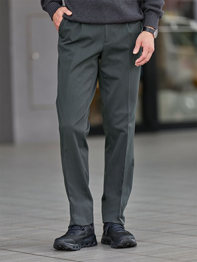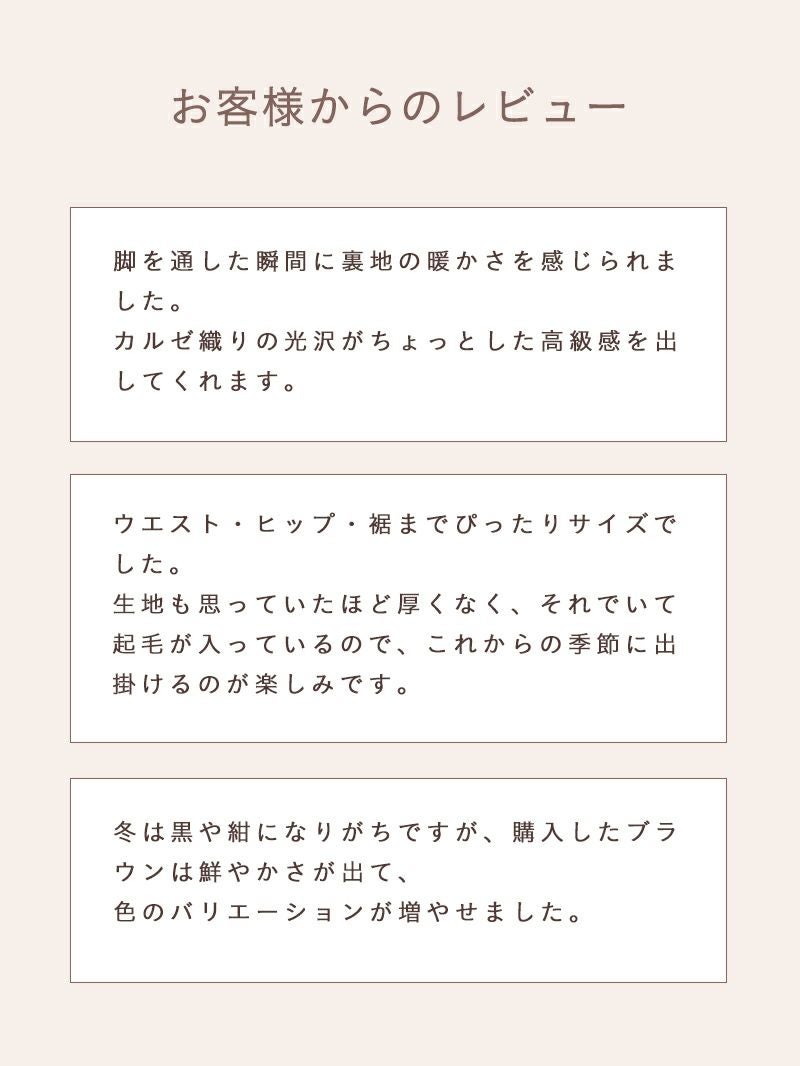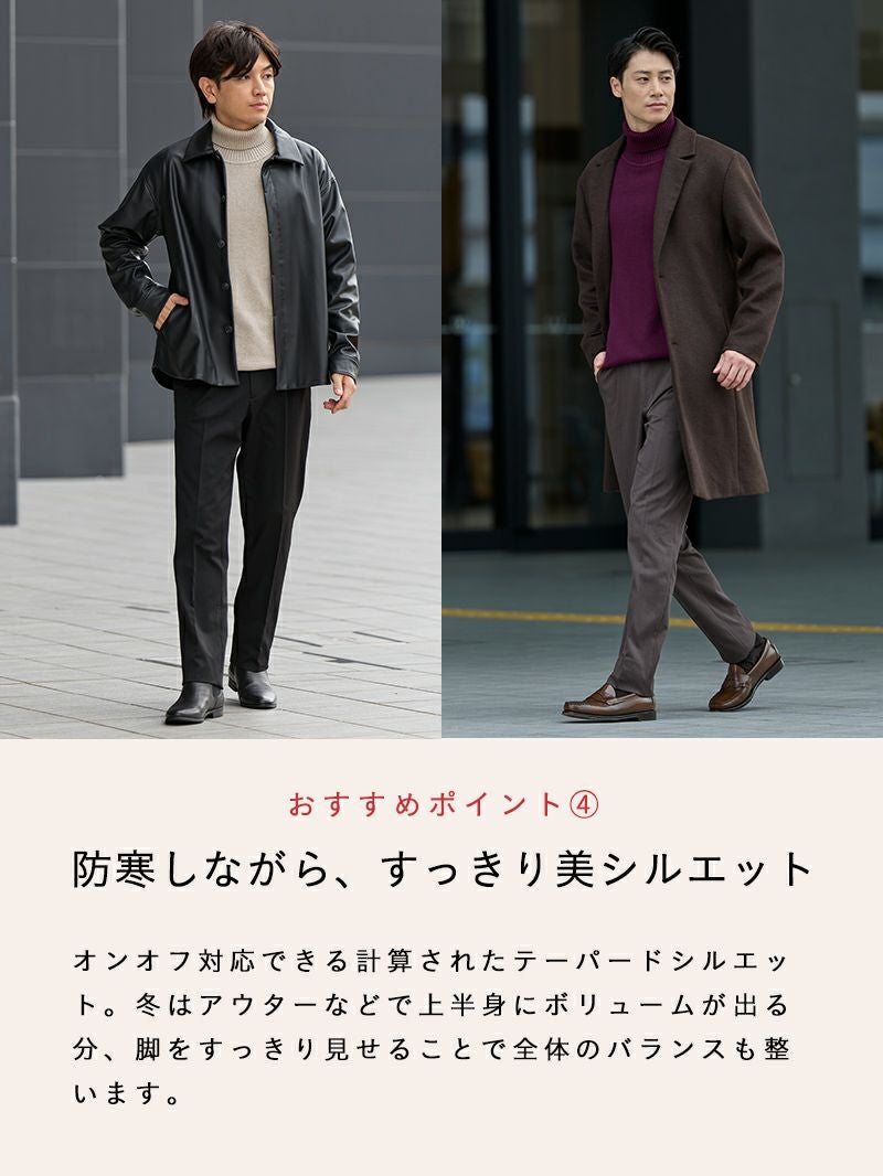 暖かさとオシャレを両立したい大人のためのテーパードパンツ CODEコードパンツとは シリーズ累計販売数22万本を誇るAUENの代表的なパンツ。見た目はドレスライクでありながら、カジュアルシーンでも着用することができます。 日本人男性に似合うシルエットを追求してつくられた、AUENこだわりの逸品です。 CODEコードテーパードウィンターの魅力 POINT01 冬でも1枚で暖かく蒸れにくい 裏起毛素材を採用し、厚手のインナーを重ねなくても快適。 保温性がありながらも蒸れにくく、冬の外出や通勤にも最適です。 POINT02 ストレッチ×ウエストゴムの"ラク穿き"仕様 ポリウレタンを8%配合し、細身のシルエットでもストレスを感じにくい伸縮性を実現。 ウエストゴムが締めつけを抑え、厚着の日でもラクに過ごせる穿き心地です。 POINT03 シワになりにくいから清潔感キープ ポリエステル主体のカルゼ織り生地を使用。 耐久性が高く、洗濯後もシワになりにくいためアイロン不要。 忙しい日々でも清潔感を保てます。 POINT04 防寒しながら、すっきり美シルエット オンオフ対応できる計算されたテーパードシルエット。 冬はアウターなどで上半身にボリュームが出る分、脚をすっきり見せることで全体のバランスも整います。 効率的にオシャレしたい男性のマストアイテム セットアップ 着回し力をもっと高めるなら、セットアップを持っておくと便利です。 CODE ウィンター セットアップ 「CODEテーパード ウィンター」と同素材・同機能のジャケットとのセットアップ。 トップスを変えるだけで、簡単に上品な着こなしが完成します。 オフィスだけでなく、プライベートでも活躍してくれる1着です。 商品を見る 対象のジャケットはこちら CODEジャケット ウィンター 商品を見る お客様の声 実際にCODEテーパードウィンターを購入されたお客様の声をご紹介 1 外側の生地感はツルッとした感触ですが、内側はフワフワしていてやや肌寒い今の時期気持ちよく暖かく着用できます。 黒や紺になりがちですが、購入したブラウンは鮮やかさが出て色のバリエーションが増やせました。 2 脚を通した瞬間に裏地の暖かさを感じられました。 カルゼ織りの光沢がちょっとした高級感を出してくれます。 3 ウエスト・ヒップ・裾までぴったりサイズでした。 生地も思っていたほど厚くなく、それでいて起毛が入っているので、これからの季節に出掛けるのが楽しみです。 4 作りもしっかりしていて、シルエットもきれいでこれから寒くなる時期にぴったりだと思います。 お買い物の不安を解消 AUENの嬉しいサービス 返品交換送料無料 はじめての方でも安心してお買い物いただけるように、 AUENでは返品交換時の送料を無料で対応させていただいています。 サイズが合わなかった場合など、こちらのサービスを是非ご利用ください! 裾上げサービス 「少しパンツの丈が長いな…」と感じた時におすすめのサービスです。 ご購入時にご希望の長さをご指定いただければ、届いてすぐに穿ける状態でお届けします。 CODEコードパンツ シルエット別ラインナップ CODEパンツは3種類のシルエットを ご用意しております。 あなたの好みや、体型にピッタリの CODEパンツを選んでみませんか? 大人キレカジ好きに◎ゆったり穿けるシルエット CODEストレート ウィンター こんな人におすすめ カジュアル寄りの服が好き 全体的に筋肉質でがっちり ボトムは窮屈感なく穿きたい 商品を見る トレンド感×体型カバー可能大人のいいとこ取りパンツ CODEワイド ウィンター こんな人におすすめ トレンド感のある着こなしが好き お尻や太ももなどの体型が気になる 高身長を活かした着こなしがしたい 商品を見る ビジネスにも最適スマートな美シルエットが魅力 CODEテーパード ウィンター こんな人におすすめ オンオフ使えるパンツが欲しい ベーシックな着こなしが好き 身長を高く見せたい 商品を見る サイズ・素材 ウエスト 股上 股下 ヒップ もも幅 すそ幅 S 80~88 25 69.5 98 30.5 17.5 M 83~92 25.5 72 101 31.5 18.5 L 86~97 26 74 105 32.5 18.5 XL 90~101 26 77 108.5 33 19 ※表記サイズは実寸であり、個体差により誤差が生じる場合があります。 ※商品によっては洗濯タグにヌード寸法が記載されておりますが、実寸とは異なります。 伸縮性 あり ややあり なし 厚み 厚手 普通 薄手 透け感 あり ややあり なし 洗濯 洗濯OK ネット使用 手洗いのみ 表地 ポリエステル92%ポリウレタン8% 裏地 なし 生産国 中国 禁止事項 乾燥機使用×日向干し×漂白剤使用× 表示を隠す サイズにお悩みですか? AIに適正サイズを聞く 返品・交換は無料で安心 ご自宅でじっくりご試着いただけます。合わなければ送料負担なく返品できます。あなたにぴったりの一着と出会えるよう、お手伝いいたします。 コーディネート Model : 179㎝ / 66㎏ / L / ブラック着用 カジュアルを品よくみせる大人コーデ カジュアルからキレイ目な着こなしまでOKなCODEパンツ。 スポーティなマウンテンパーカを合わせれば軽快なスタイルが完成します。 
