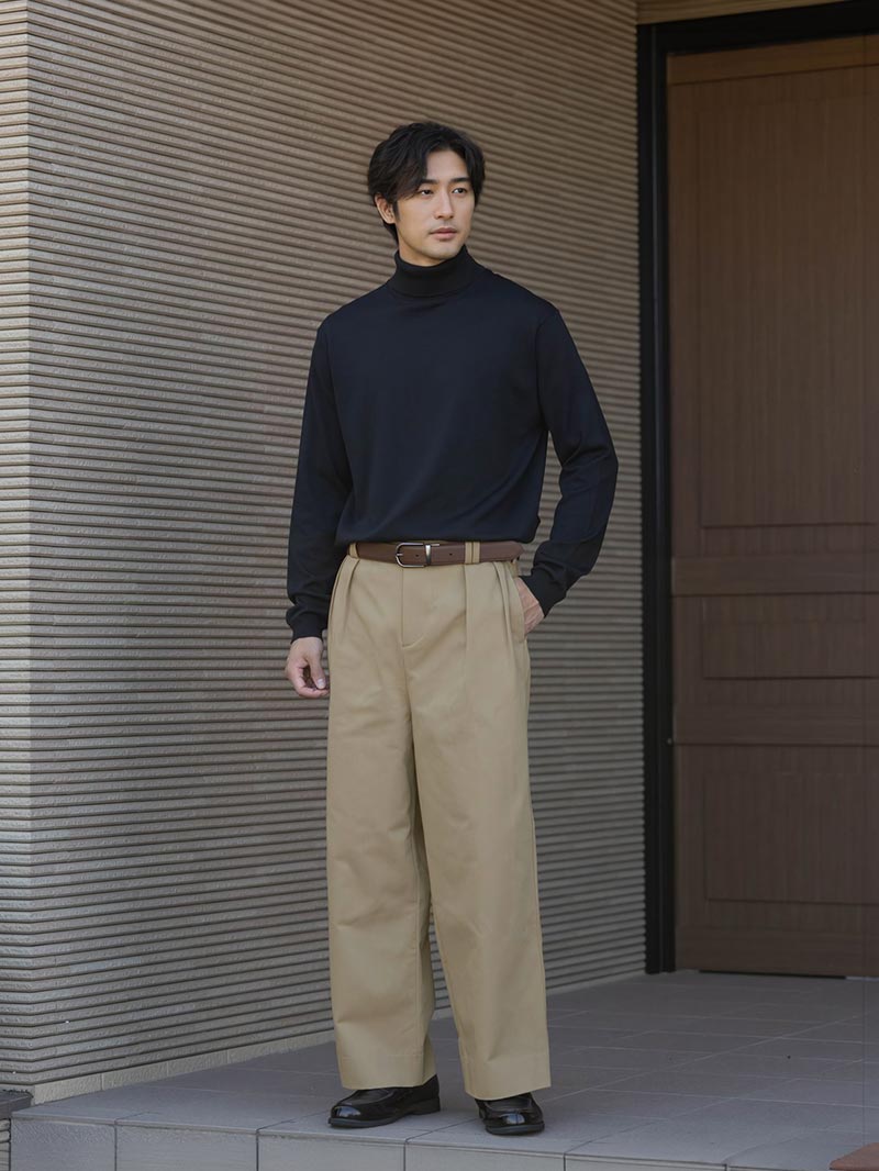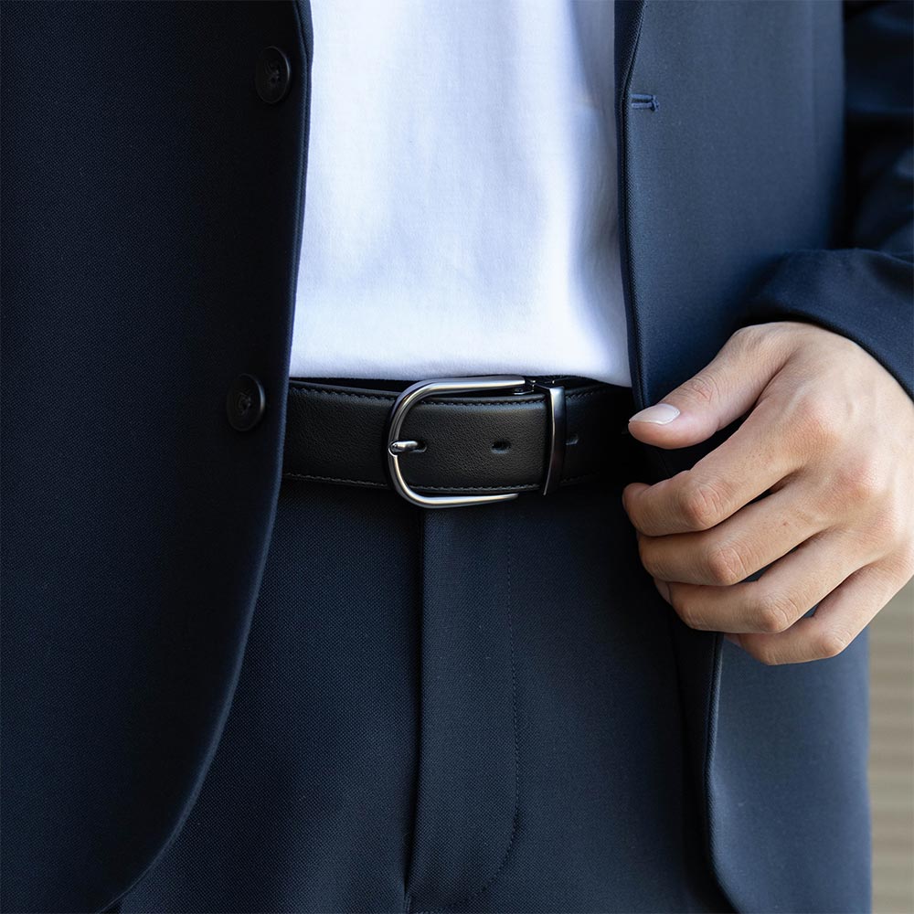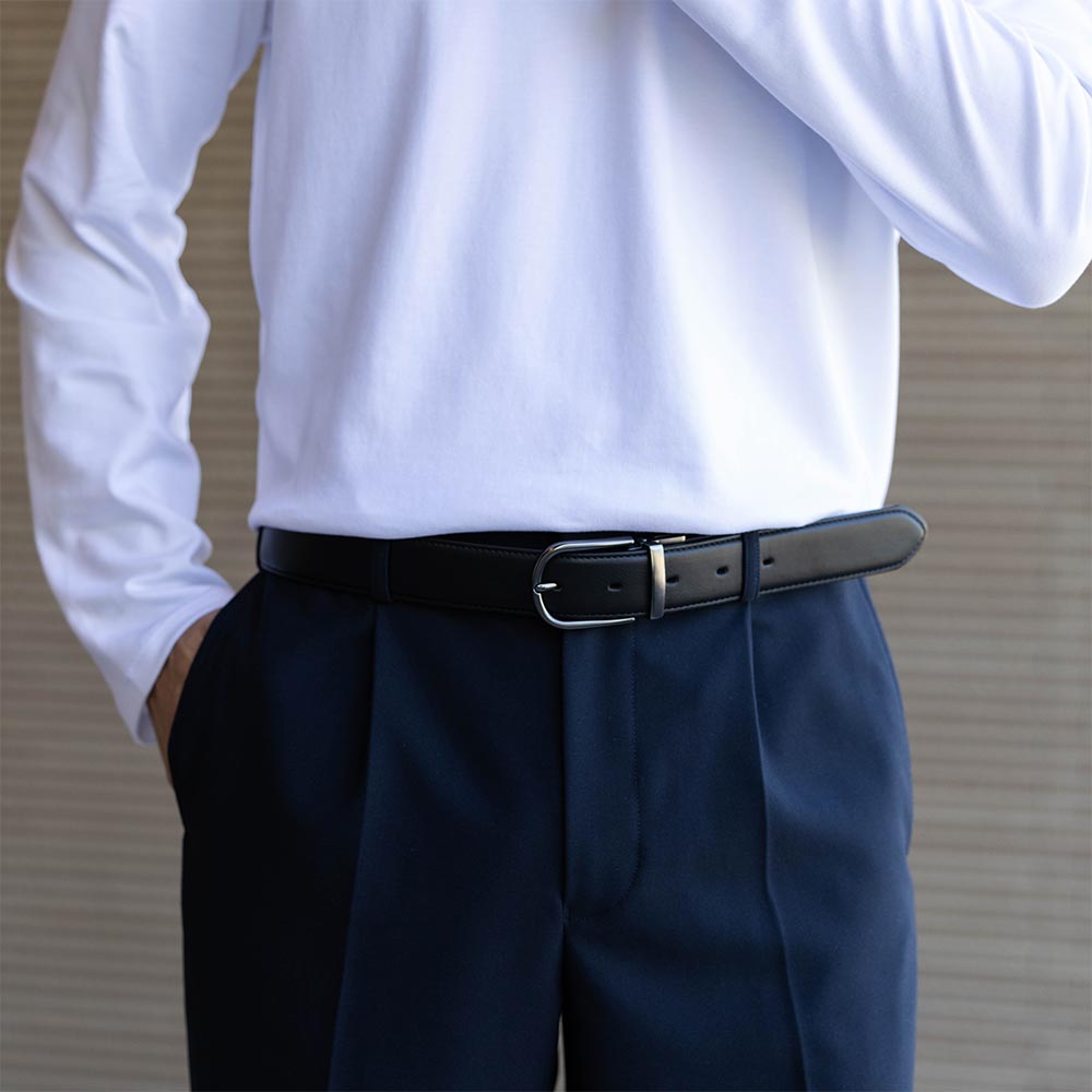 アイテム説明 ブラック⇔ブラウンを切り替えられる便利なベルト バックルが回転式になっていて、ブラック⇔ブラウンの切り替えがスムーズにできます。 素材は牛革を使用しているので、使うほどに味が出てなじみます。 もっと見る バックルはツヤを抑えたラウンド型 角ばったバックルは主張しがちで、ビジネス感が強く出てしまうので、主張しすぎず上品なラウンド型を採用しました。 ツヤを抑えることでギラつかず、革の質感を引き立てます。 牛革を使用しているので、使うほどに柔らかくなり馴染みます。 ベルト幅は3.5cm ベルトループにしっかりフィットし、ウエストまわりがだらしなく見えない安定感のある幅にしました。 長さは自由に調節可能 体型に合わせて自由にカットできるのでギフトにもオススメです。 サイズ・素材 全長 幅 最小穴 最大穴 F 113 3.5 91 103 ※表記サイズは実寸であり、個体差により誤差が生じる場合があります。 ※商品によっては洗濯タグにヌード寸法が記載されておりますが、実寸とは異なります。 素材 牛革 生産国 中国 表示を隠す サイズにお悩みですか? AIに適正サイズを聞く 返品・交換は無料で安心 ご自宅でじっくりご試着いただけます。合わなければ送料負担なく返品できます。あなたにぴったりの一着と出会えるよう、お手伝いいたします。 コーディネート Model : 179㎝ / 66㎏ / F / ブラック×ブラウン着用 黒ベルトで引き締める大人セットアップ ネイビーのセットアップを引き締める黒ベルトがポイント。 白カットソーで軽さをプラスして、落ち着きのある大人らしい雰囲気になります。 CODEジャケット CHECK ハイゲージ長袖カットソー CHECK CODEテーパード CHECK Model : 179㎝ / 66㎏ / F / ブラック×ブラウン着用 ブラウンベルトで品よく仕上げる秋コーデ 深みのあるブラウンベルトがコーデにアクセントを加えます。 全体をやわらかくまとめることで、上品さと落ち着きのある雰囲気になります。 ハイゲージシルクタートルニット CHECK ワイドチノパンツ CHECK スタッフコーディネート もっと見る