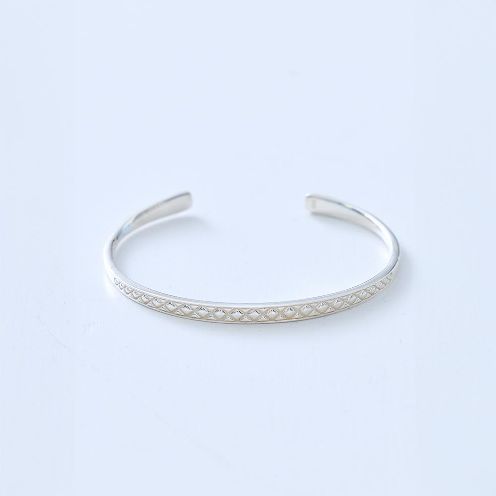 アイテム説明 ミニマルに映えるシルバー925バングル フロントに刻んだアーガイルパターンが、トラッドなアクセントに。 シルバー925の深い輝きと錆びにくいタフさで、日常の装いをワンランクアップします。 もっと見る いつものコーディネートをワンラックアップさせるデザインバングル バングルは、装飾性がありながらも主張しすぎず、コーディネートを引き締める役割を果たします。 また、ちょっとしたこなれ感も演出できるので大人の男性にこそオススメのアイテムです。 フロントのアーガイル柄デザイン アーガイル柄は、トラッドで知的なイメージがあり、制服やユニフォームによく用いられる定番の柄です。 知的、上品で存在感があり、洗練された印象を与えるので大人の男性にピッタリ。 着け心地も抜群 高い耐久性がありつつ付け口がフレキシブルに動くので着脱が簡単。ストレスフリー。 ATENTTION デリケートな素材なので優しく曲げていって自分のサイズに調整してください。 サイズ・素材 手首回り 幅 F 20 0.3 ※表記サイズは実寸であり、個体差により誤差が生じる場合があります。 ※商品によっては洗濯タグにヌード寸法が記載されておりますが、実寸とは異なります。 表地 SILVER925 裏地 なし 生産国 中国 表示を隠す サイズにお悩みですか? LINEでサイズ相談する 返品・交換は無料で安心 ご自宅でじっくりご試着いただけます。合わなければ送料負担なく返品できます。あなたにぴったりの一着と出会えるよう、お手伝いいたします。 コーディネート Model : 179㎝ / 66㎏ / F / シルバー着用 ダークカラーで魅せる大人コーデ ダークカラーでまとめた大人カジュアルコーデ。 男性らしくクールな印象を与えてくれます。 シンプルにまとまっているので、手首にはシルバーのバングルをつけてアクセントをプラスしましょう。 ルーズシルエットニット CHECK CODEストレートパンツ ウールブレンド 通年用 CHECK Model : 179㎝ / 66㎏ / F / シルバー着用 同系色でまとめたストライプシャツコーデ ストライプ柄を使った爽やかコーデ。 スはネイビーを合わせて同系色で統一することで、まとまりがあり大人な印象に仕上がります。 腕まくりをしてシルバーのアクセを合わせることで、こなれた雰囲気に。 リラックスシルエットストライプシャツ CHECK クールタッチスムースTシャツ CHECK CODEストレートパンツ ウールブレンド 通年用 CHECK スタッフコーディネート もっと見る