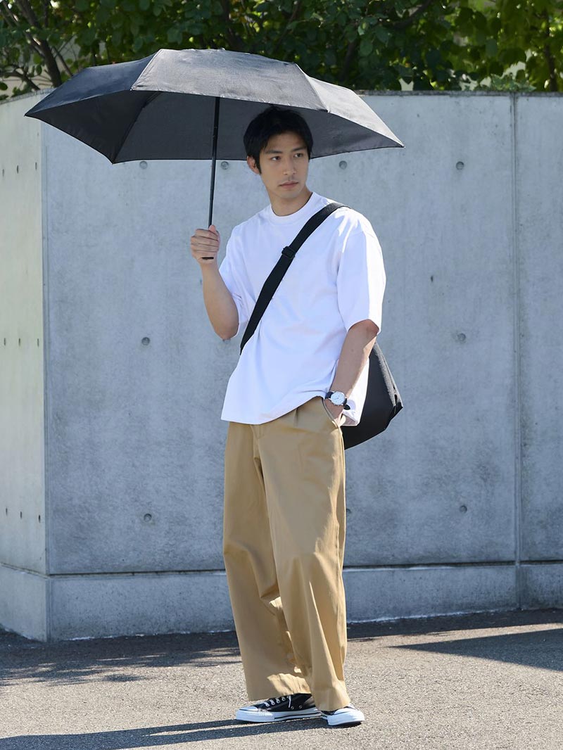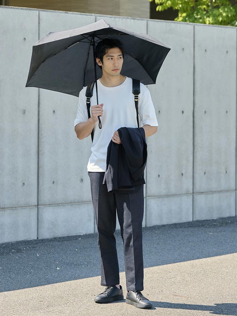 アイテム説明 晴れの日も使える、UVカット機能付き傘 UVカット率90%で、紫外線対策にも嬉しい一本。 晴雨兼用のため、強い日差しの日はもちろん、急な雨にも対応。 シンプルながらも機能性とスタイルを兼ね備えた傘です。 もっと見る 頼れる大判サイズ。風に強くてスマートな自動開閉 60cmサイズの大判自動開閉傘。 ワンプッシュで開閉でき、急な雨でも片手でサッと使えるスマートな仕様です。 骨組みにはグラスファイバーを使用しており、風に強く、耐久性にも優れています。 大きめサイズでしっかりカバー 一般的な折りたたみ傘より一回り大きく、荷物があっても濡れにくいのが特長。 肩まわりを守りたいビジネスパーソンにも最適で、日差しや雨量の多い日でも安心感のあるサイズ設計です。 ワンタッチ自動開閉でストレスフリー ボタンを押すだけで開閉できる自動開閉仕様。 片手でスムーズに操作できるので、荷物が多い日や急な雨でもスマートに対応できます。 耐風設計&グラスファイバー骨 骨には柔軟性と耐久性に優れたグラスファイバー素材を使用。 強風時の煽りや折れに対しても高い耐性を持ち、壊れにくく、長く使える構造です。 傘が裏返りにくいのも嬉しいポイント。 サイズ・素材 親骨サイズ 直径 折りたたみ時 F 60 106 30 ※表記サイズは実寸であり、個体差により誤差が生じる場合があります。 ※商品によっては洗濯タグにヌード寸法が記載されておりますが、実寸とは異なります。 生地 ポリエステル100% 重さ 300g 生産国 中国 表示を隠す サイズにお悩みですか? LINEでサイズ相談する 返品・交換は無料で安心 ご自宅でじっくりご試着いただけます。合わなければ送料負担なく返品できます。あなたにぴったりの一着と出会えるよう、お手伝いいたします。 コーディネート Model:179㎝ / 66㎏ / F / ブラック着用 急な天気にも頼れる清潔感スタイル 白Tシャツなら、雨の日でも清潔感のある印象に。 足元は撥水性のあるシューズがおすすめです。 ジャケットを脱いでも、リュックを背負っても、大きめの傘ならしっかりカバーしてくれるので、出勤や外回りも快適に過ごせます。 裏地メッシュテーラードジャケット CHECK クールタッチスムースTシャツ CHECK CODEテーパード デニム CHECK スマートスニーカー CHECK Model:179㎝ / 66㎏ / F / ブラック着用 荷物が多くても快適に過ごせる旅行コーデ 真っ白なTシャツと素朴であたたかみのあるベージュのパンツは、夏らしくナチュラルな雰囲気に。 足元はボリュームのないコンバースで軽やかにまとめるのがポイントです。 旅行などで荷物が多くなりがちな日も、大きめの傘なら雨に濡れる心配がなく、安心して持ち運べます。 ヘビーウェイトスピンドルTシャツ CHECK タックワイドパンツ CHECK REGiSTA撥水加工ショルダーバッグ CHECK Salvatole Marra クロノグラフ腕時計 CHECK スタッフコーディネート もっと見る