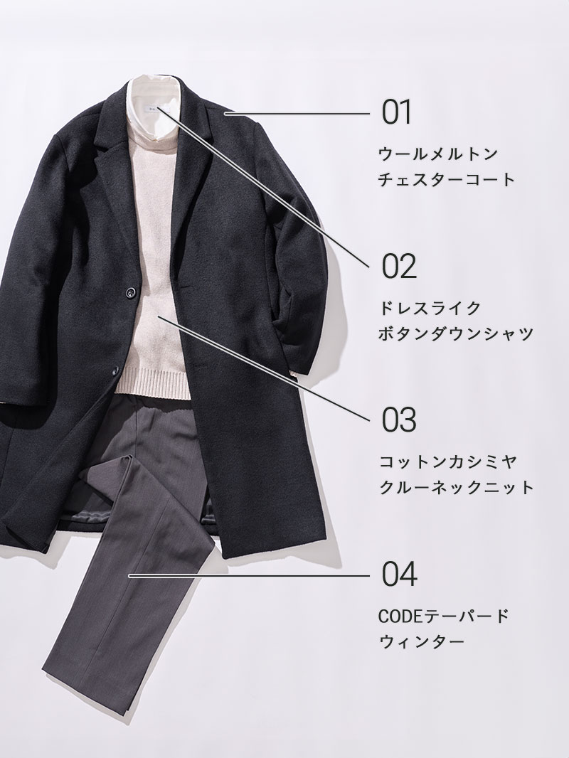上質なニットとほのかな光沢感が魅力のチェスターコートで、上品な大人の雰囲気を演出。センタープレスの効いたパンツできちんと感をキープし、オンオフ対応できる万能コーデです。