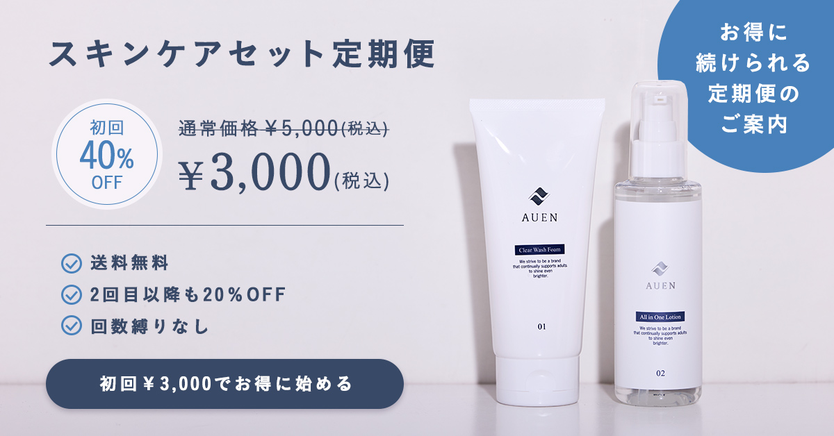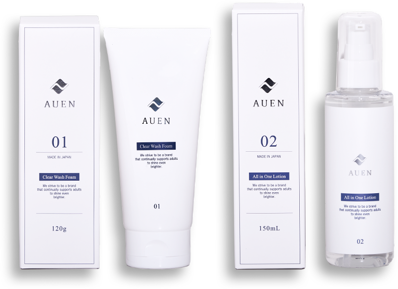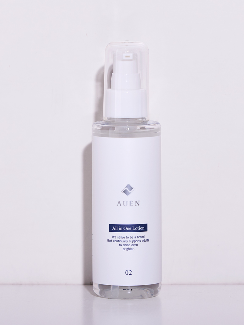 パッケージリニューアルのお知らせ DCOLLECTIONからAUEN[オーエン]へのブランド名変更に伴い、スキンケア商品のパッケージをリニューアルいたします。 ※内容量・品質・価格はこれまでと変わりません。現行パッケージの在庫がなくなり次第、順次切り替えとなります。 ※セット商品をご注文の場合、現行パッケージと新パッケージが混在する場合がございます。あらかじめご了承ください。 お客さまの声が続々と届いてます 1本で完結するシンプルさがとても好きです 肌の乾燥が気になって、どんなスキンケアがいいのか悩んでいた時に友人に勧められたのが「オールインワンローション」でした。 スキンケア用品はたくさんありますが、保湿が1本で完結するシンプルさがとても好きです! オールインワンローションを初めてから、気持ちも前向きになった気がします。 ※個人の感想であり、使用感には個人差があります 面倒で続かなかった私が・・・ 最近周りがAUEN(旧DCOLLECTION)のスキンケアを使い始めたと聞き、自分もと思い購入しました。 元々肌荒れ等に悩んでいたわけではないのですが、こちらのスキンケアを使い始めてから朝の肌が好きになりました! これまで何度か他の導入液や化粧水、乳液等を使ったことはあるのですが、何種類も使用することが面倒で続きませんでした。でもオールインワンローションは1本でいいので続けやすく個人的にすごく助かってます。 ※個人の感想であり、使用感には個人差があります 年齢による肌の変化がキッカケでした これまで洗顔くらいしか肌ケアをしてこなかったんですが、年齢による肌の変化か、乾燥が気になるようになりました。 そんなとき、友人の勧めでオールインワンローションを使い始めることに。 使い始めてからは肌の調子が良くて、もう朝晩のルーティンになりました。 ※個人の感想であり、使用感には個人差があります どうしてオールインワンローションは大人の男性に選ばれるのか 男性の肌は皮脂により肌の表面にしか成分が浸透しにくい そもそも肌に良いとされる成分の多くは、水溶性です。 しかし人間の肌は皮脂により、水溶性成分を弾きやすく肌の角質層まで成分を届けにくいといった性質があります。 しかも男性は皮脂分泌量が女性の2~3倍 女性と同様のスキンケアを行っても皮脂が多い分、十分にスキンケアの効果が得られていない可能性があるんです。 女性 男性 約3倍 でも男性のためのオールインワンローションなら 独自の技術で、皮脂の多い男性の肌にも角質層まで成分が浸透。 12種類の植物由来成分を「ナノ化」。肌への浸透力UPで健やかな肌に。 オールインワンローション point01 浸透テクノロジー 独自技術で有効・有用成分を角質層まで浸透 男性の肌は水分量が少なく、保湿をしないとバリア機能が低下し、肌トラブルの原因に。 皮脂によって浸透しずらかった有用・有効成分も浸透テクノロジーを搭載したことで角質層まで浸透し、ハリツヤのある肌に導きます。 point02 12種類の植物由来成分を「ナノ化」 乾燥やテカリ、肌荒れなど、年齢肌を健やかで潤いのあるは肌に整える12種類の植物由来成分配合。 さらに「ナノ化」することで、肌の表面だけでなく角質層まで成分を浸透。 肌の基礎を作り、みずみずしく潤った素肌へ。 point03 8つの無添加を実現敏感肌にも嬉しいエイジングケア* 低刺激なので、敏感肌でお悩みの方でも毎日ご使用いただけます。 *年齢に応じたお手入れ 他にもたくさんの喜びの声をいただいています ※個人の感想であり、使用感には個人差があります トロッとした液なのに、肌に塗ると水のようにスーと浸透してくれるのでベタつかなくていい感じです!スキンケアに慣れていない僕でも使いやすかったです。 30代/男性 化粧水と乳液を用意しなくても1本で保湿できるのが魅力的です。 オールインワンローションを使い始めてから朝、鏡で自分の肌を見るのが好きになりました! 40代/男性 しっとりさっぱりする使用感が好きで、愛用しています。 寝る前、起床後のルーティンで1日中肌がしっとりとして好きです。 30代/男性 敏感肌で化粧水難民だった僕でも、使いやすかったです! 朝晩使用して大体2か月くらい持つので、価格面でも続けやすいです。 50代/男性 エイジングケア*は続けることが大切だから男性でも続けられる工夫をしました *年齢に応じたお手入れ point01 保湿はこれ1本で完結! あまりスキンケア慣れしていない男性にとって化粧水に美容液に乳液...と塗り重ねるのが面倒に感じる方も多いはず。 でもオールインワンローションは化粧水・美容液、乳液、アフターシェーブを1本で完結できるから楽で続けやすいんです。 基本スキンケア オールインワンローション STEP1 洗顔 STEP2 化粧水 オールインワンローション STEP3 美容液 STEP4 乳液 完了 point02 安心して使っていただけるように製造の全工程を日本で完結 お客さまに安心して使っていただけるように、AUEN(旧DCOLLECTION)の化粧品は、製造の全工