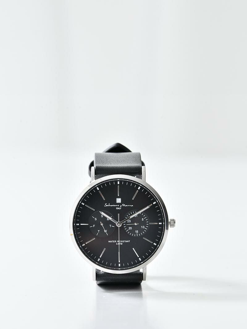 Salvatole Marra サルバトーレマーラは2009年に日本で販売を開始した「挑発とエレガンス」をテーマとしたブランドです。 質、デザイン、機能にこだわったビジネスやカジュアルに最適な腕時計です。 シンプル&スタイリッシュなデザインが好印象 どのようなコーデにも馴染みやすいシンプルなデザインながらも日付・曜日表示機能付きで、ビジネスシーンでも利用できるアイテム。 もっと見る 高級感のある本革ベルト ステンレス等と比べて軽量で、腕が疲れにくいのも嬉しいポイント。 家族や恋人などへのギフトにも◎ 専用の化粧箱にいれてのお届けのため、自分用としてはもちろん、プレゼントとしても喜ばれるアイテムです。 どんなシーンにもマッチ 左:オフィカジ/右:普段着 シンプルなデザインなので、どんなコーディネートにもマッチします。 サイズ・素材 直径 手首回り 幅 F 3.8 14~23 1.8 ※表記サイズは実寸であり、個体差により誤差が生じる場合があります。 ※商品によっては洗濯タグにヌード寸法が記載されておりますが、実寸とは異なります。 ※返品・交換・修理保証をご希望の際は保証書があることを必ずご確認ください。 ※保証書がない場合は受付・対応でき兼ねますので紛失にご注意ください。 ※保証内容:お買い上げ後1年以内に生じた自然故障(電池切れを除く) 素材 ベルト:レザー ムーヴメント:国内メーカー製クオーツ 生産国 中国 表示を隠す サイズにお悩みですか? AIに適正サイズを聞く 返品・交換は無料で安心 ご自宅でじっくりご試着いただけます。合わなければ送料負担なく返品できます。あなたにぴったりの一着と出会えるよう、お手伝いいたします。 コーディネート Model : 179㎝/66㎏/ F / ブラック着用 長袖レギュラーシルエットTシャツ CHECK ブラックスリムパンツ 旧型 CHECK Uチップシューズ CHECK Model : 179㎝/66㎏/ F / ホワイト着用 比翼仕立てタイプライターシャツ CHECK テックワイドパンツ(セットアップ対応) CHECK スウェードレザースニーカー CHECK スタッフコーディネート もっと見る