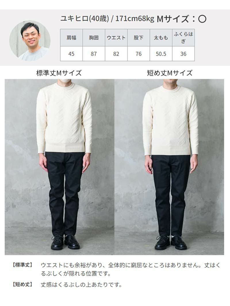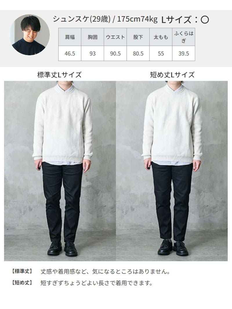 アイテム説明 毎日が「きちんと」に更新される黒のスリムパンツ おしゃれはボトムから。 面積の半分を占める“線”を整えれば、全身がすっと整う。 10年以上の改良を重ねたシリーズは累計32万本。 もっと見る オシャレを始める時は ボトムから オシャレを始める時はボトムからというのがオシャレの教科書の理論です。 理由はボトムはコーディネート全体の50%を占め、見た目の影響が大きいからです。 黒のスリムパンツを キレイめに仕上げました 左:一般的なスキニーパンツ/右:ブラックスリムパンツ(当商品) 一般的なスキニーパンツと比較し、ほどよいゆとりを持たせています。スッキリとしたシルエットはそのままに、窮屈感なく快適にお過ごしいただける設計になっています。 左:一般的な綿パンツの生地/右:ブラックスリムパンツ(当商品) 光沢感のある素材を使用することで大人っぽさが引き立ち、上品な仕上がりに。 左:一般的な5ポケット/右:ブラックスリムパンツ(当商品) バックポケットは貼り付けポケットではなく、ジャケットやスラックスによく見られる箱ポケット仕様で、よりドレッシーな印象に仕上げています。サイドポケットも同じように、スラックスに多いスラントポケット仕様を採用しました。 積み重ねてきた アップデート 左:標準丈/右:短め丈 穿いた時にクッションが出てしまうとせっかくのスリムシルエットが台無しになってしまいます。丈感はくるぶしにかかるくらいがオススメです。 オシャレなシルエットと 色合わせが自動で完成 細身のスッキリとしたシルエットでありながらもストレッチ性を付与することでストレスのない履き心地になっています。 バックルまでブラックに仕上げたこちらのベルトは、黒系パンツと合わせやすいようにデザインしました。バックルの主張が抑えられるので、シンプルな着こなしに仕上がります。 一緒におすすめ オールブラックレザーベルト CHECK サイズ・素材 標準丈 ウエスト 股上 股下 もも幅 すそ幅 S 78~86 26 71.5 29 16 M 82~90 27 72 30 17 L 85~93 28 75 31 19 XL 88~98 29.5 76.5 32.5 19 短め丈 ウエスト 股上 股下 もも幅 すそ幅 S 81~88 27 68 29.5 16 M 83~90 28 68.5 30.5 17 L 85~92 28.5 71 31.5 18 XL 90~97 29 73 32 19 ※表記サイズは実寸であり、個体差により誤差が生じる場合があります。 ※商品によっては洗濯タグにヌード寸法が記載されておりますが、実寸とは異なります。 伸縮性 あり ややあり なし 厚み 厚手 普通 薄手 透け感 あり ややあり なし 洗濯 洗濯OK ネット使用 手洗いのみ 表地 綿67% ポリエステル31% ポリウレタン2% 裏地 なし 生産国 中国 表示を隠す スタッフ試着レビュー サイズにお悩みですか? LINEでサイズ相談する 返品・交換は無料で安心 ご自宅でじっくりご試着いただけます。合わなければ送料負担なく返品できます。あなたにぴったりの一着と出会えるよう、お手伝いいたします。 コーディネート Model : 179㎝ / 66㎏ / XL / ブラック(標準丈)着用 Iラインシルエットで作るキレイめコーデ 黒スリムパンツは、細身のトップスと合わせてIラインシルエットを作るのがおすすめ。 黒にグレージュと落ち着いた色合わせに加え、シルエットのスマートさが、オフィスにもピッタリなコーデに仕上げてくれます。 コットンカシミヤ クルーネックニット CHECK CODEロングスリーブTシャツ CHECK Salvatole Marra クロノグラフ腕時計 CHECK 調光レンズサングラス/クラウンパント CHECK Model : 179㎝ / 66㎏ / XL / ブラック(標準丈)着用 黒スリムで仕上げる定番ジャケパンスタイル オフィカジOKな職場には、定番のジャケパンスタイルがおすすめ。 細身×キレイめな黒でカジュアルになりすぎない黒スリムパンツを合わせることで、品の良さを感じさせるジャケパンスタイルが完成します。 ハイゲージシルクニット CHECK CODEジャケット ウィンター CHECK 調光レンズサングラス/クラウンパント CHECK Model : 179㎝ / 66㎏ / XL / ブラック(標準丈)着用 デニムシャツ×黒スリムで作るラフコーデ ゆったりとしたデニムシャツは、細身のパンツでシルエットに変化をつけるのが◎。 黒スリムパンツは主張が強すぎないため、ボタンを開けたり腕まくりをしたりと、デニムシャツに変化をつけてもオシャレにキマります。 リラクシーデニムシャツ CHECK CODEロングスリーブTシャツ CHECK 調光レンズサングラス/クラウンパント CHECK Model : 179㎝ / 66㎏ / XL / ブラック(標準丈)着用 ストライプシャツで楽しむリラックスカジュアル 無地かつ色合わせに悩まない黒のスリムパンツは、柄物トップスとの組み合わせも楽しめるアイテム。 ストライプシャツを合わせれば、コーデにアクセントを加えつつ、爽やかな印象を与えることができますよ。 バンドカラースキッパーストライプシャツ CHECK Salvatole Marra クロノグラフ腕時計 CHECK スタッフコーディネート もっと見る