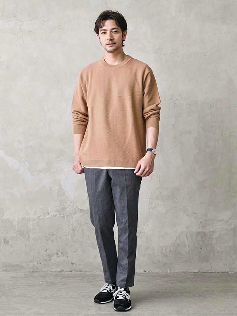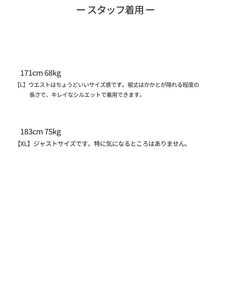 アイテム説明 なめらかな手触りと光沢感のあるツイル織を採用 もっと見る オフィスに適したデザイン タックとセンタープレスが美しいシルエットをキープし、オフィスシーンで活躍 お客様の声によりドローコードを加えたニューアル。ベルトが無くてもウエストの調節が可能で穿き心地がより一層向上しました。 ウエストゴム仕様で腰まわりに余裕を。体型変化へのカバー力にもこだわりました。 伸縮性のある素材のため、柔軟な動きにもしっかり対応できます。 インナーを選ぶだけで完成するセットアップ 同色・同素材のカバーオールと組み合わせれば、上品でスタイリッシュなセットアップスタイルの完成。セットアップコーデは簡単にオシャレな色合わせ・シルエットに仕上がります。 セットアップはアウターとパンツが決まっているので、あとはインナーを決めるだけでOK。色合わせとシルエットのポイントを押さえたオシャレな好印象コーデが自動で完成します。 一緒におすすめ オーバーシャツジャケット CHECK ルーズシルエットニット 24年モデル CHECK ストライプシャツ CHECK クルーネック半袖Tシャツ CHECK サイズ・素材 ウエスト 股上 股下 ヒップ もも幅 すそ幅 L 82.5~90 27.5 73 - 32 18 XL 83.5~92 28 75 108 33 18.5 ※表記サイズは実寸であり、個体差により誤差が生じる場合があります。 ※商品によっては洗濯タグにヌード寸法が記載されておりますが、実寸とは異なります。 伸縮性 あり ややあり なし 厚み 厚手 普通 薄手 透け感 あり ややあり なし 洗濯 洗濯OK ネット使用 手洗いのみ 表地 ポリエステル65% 綿33% ポリウレタン2% 裏地 なし 生産国 中国 表示を隠す サイズにお悩みですか? AIに適正サイズを聞く 返品・交換は無料で安心 ご自宅でじっくりご試着いただけます。合わなければ送料負担なく返品できます。あなたにぴったりの一着と出会えるよう、お手伝いいたします。 コーディネート Model : 179cm / 66kg / L / ブラック着用 オーバーシャツジャケット CHECK 重ね着専用タンクトップ CHECK Model : 179cm / 66kg / L / ブラック着用 プルオーバーシャツ CHECK whoop'-de-doo'プレーンレザーシューズ CHECK Salvatole Marra シンプル腕時計 CHECK オールブラックレザーベルト CHECK Model : 179cm / 66kg / L / 杢グレー着用 オーバーシャツジャケット CHECK バンドカラーシャツ CHECK PUレザースニーカー CHECK Model : 179cm / 66kg / L / 杢グレー着用 LIQUID ニット カルゼ編み CHECK 重ね着専用タンクトップ CHECK Salvatole Marra シンプル腕時計 CHECK オールブラックレザーベルト CHECK スタッフコーディネート もっと見る