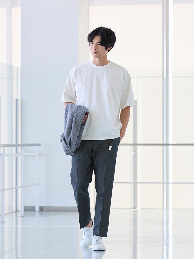 白スニーカーが程よい抜けをつくり、重たく見せず軽快さも感じられる仕上がりです。