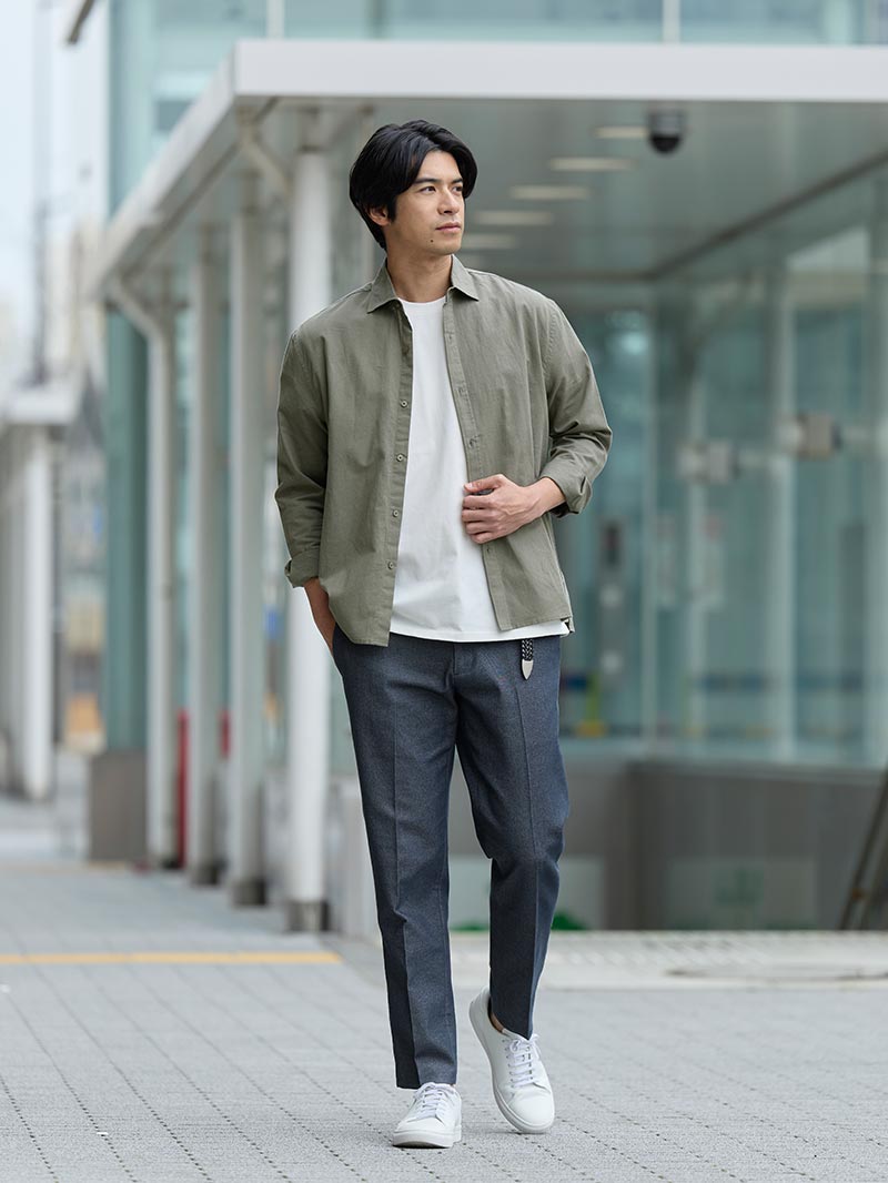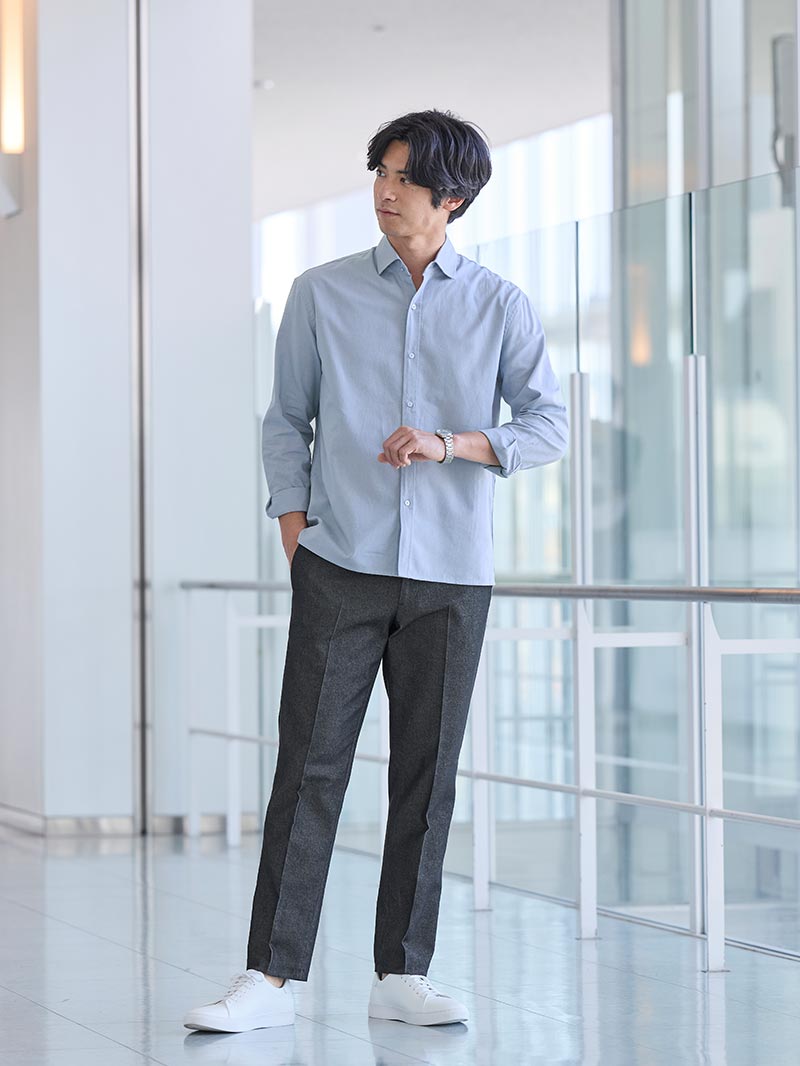 淡いブルーのシャツが視線を引き寄せ、全体に清潔感と軽やかさをプラス。