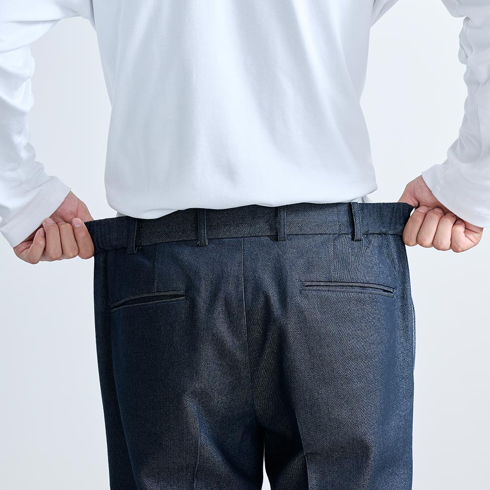 CODEシリーズのテーパードシルエットをデニム調生地でブラッシュアップ。