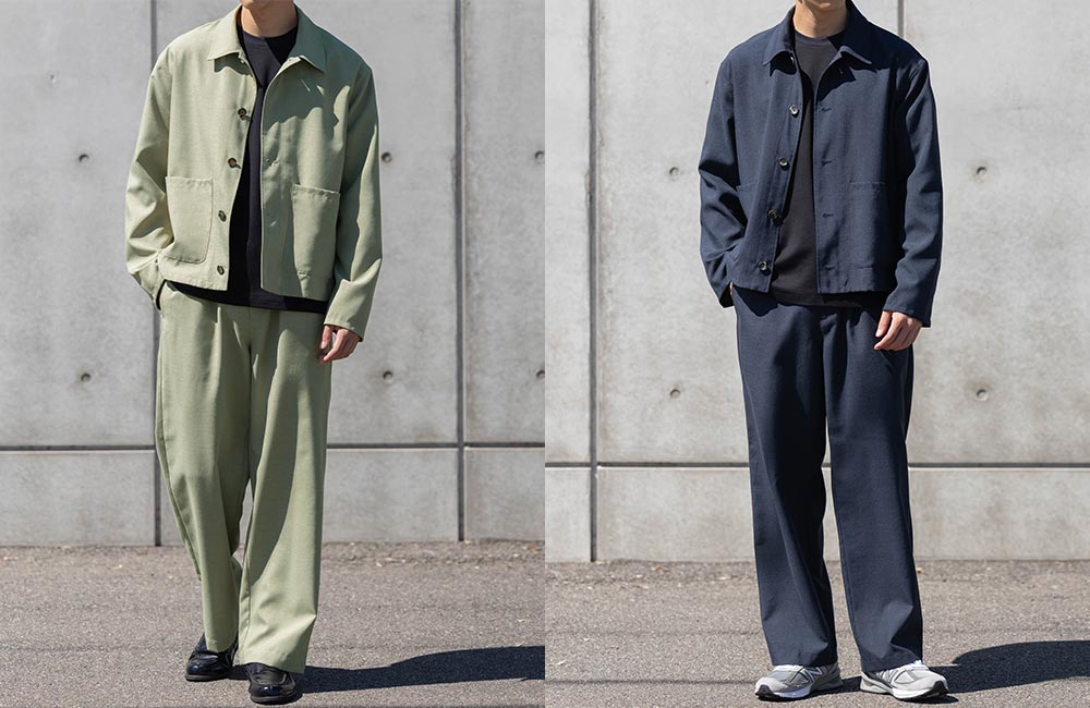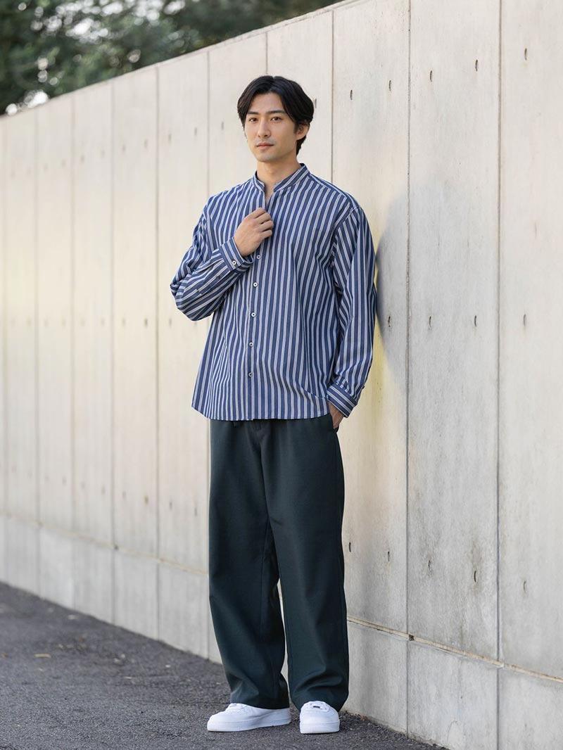 清涼感のあるストライプシャツを重ねることで、ワイドパンツが軽快な表情に。