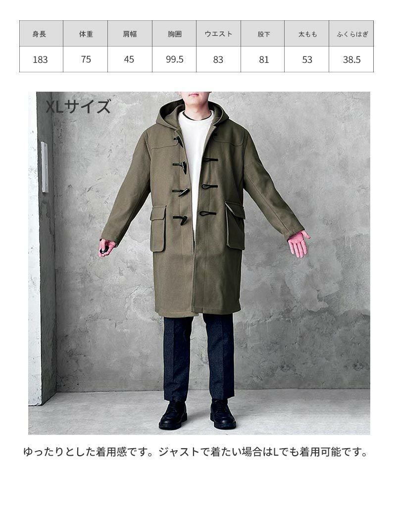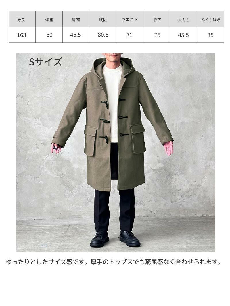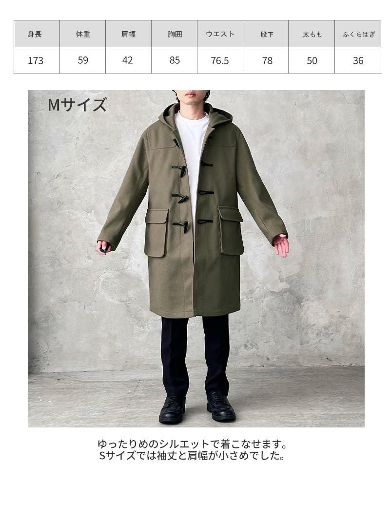 アイテム説明 上質な暖かさを纏う クラシカルなデザインとトレンドのシルエットで、寒い季節に上品な存在感をプラスするダッフルコート。 もっと見る 重厚感のあるトグルボタン トグルボタンは水牛風のものですが重厚感のある手触り。見た目の印象を左右する紐は牛革を使用しています。 トレンド感のあるシルエット ゆったりサイズでトレンド感のある着こなしに。 サイズ・素材 肩幅 身幅 袖丈 着丈 S 47 57 60 95 M 49 59 61 97 L 52.5 62 62 100 XL 55 64 63 102.5 ※表記サイズは実寸であり、個体差により誤差が生じる場合があります。 ※商品によっては洗濯タグにヌード寸法が記載されておりますが、実寸とは異なります。 伸縮性 あり ややあり なし 厚み 厚手 普通 薄手 透け感 あり ややあり なし 洗濯 洗濯OK ネット使用 手洗いのみ 表地 ポリエステル100% 裏地 ポリエステル100% 生産国 中国 表示を隠す サイズにお悩みですか? AIに適正サイズを聞く 返品・交換は無料で安心 ご自宅でじっくりご試着いただけます。合わなければ送料負担なく返品できます。あなたにぴったりの一着と出会えるよう、お手伝いいたします。 コーディネート Model : 173㎝/68㎏/ L / グレージュ着用 ミラノリブタートルネックニット CHECK コートレザースニーカー CHECK Model : 173㎝/68㎏/ L / グレージュ着用 リバーシブルマフラー CHECK Model : 173㎝/68㎏/ L / ネイビー着用 ウールアランニット CHECK Uチップシューズ CHECK Model : 173㎝/68㎏/ L / ネイビー着用 ミニケーブル編みニット CHECK スタッフコーディネート もっと見る