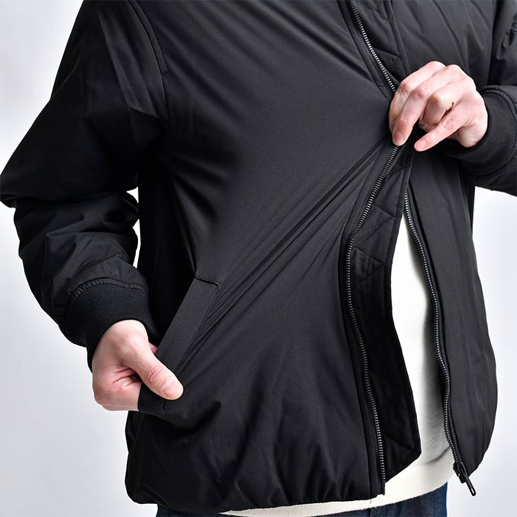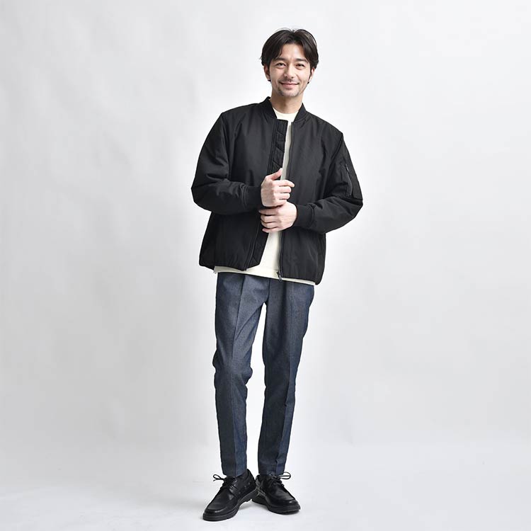 アイテム説明 大人のためのテックMA-1 シンプルなデザインの中に、撥水・防風・調温の機能を凝縮。 30代40代の大人男性にピッタリなMA-1ジャケットです。 アクティブシーンでも快適に、オシャレを楽しんでくださいね! もっと見る 機能性アウターなのにスタイリッシュなデザインが魅力的 隙間風が入り込まないよう、防風対策が施された作りとなっています。また、撥水加工も施されているため急な雨にも対応できますよ。 ストレッチでストレスフリーな着心地 伸縮性に優れているため窮屈感も軽減され、動きやすいのが特徴です。 相性のいいトップス ハイゲージタートルネックニット CHECK スウェットプルパーカー CHECK サイズ・素材 肩幅 身幅 袖丈 着丈 M 46 57 60.5 65 L 47.5 59 62 66 LL 48 61 63.5 68 ※表記サイズは実寸であり、個体差により誤差が生じる場合があります。 ※商品によっては洗濯タグにヌード寸法が記載されておりますが、実寸とは異なります。 伸縮性 あり ややあり なし 厚み 厚手 普通 薄手 透け感 あり ややあり なし 洗濯 洗濯OK ネット使用 手洗いのみ 表地 ポリエステル100% (裏側にポリウレタン樹脂コーティング加工) 中綿:ポリエステル100% リブ部分:ポリエステル97% ポリウレタン3% 裏地 ポリエステル100% 生産国 中国 表示を隠す サイズにお悩みですか? LINEでサイズ相談する 返品・交換は無料で安心 ご自宅でじっくりご試着いただけます。合わなければ送料負担なく返品できます。あなたにぴったりの一着と出会えるよう、お手伝いいたします。 コーディネート Model : 171cm / 55kg / M / ブラック(06)着用 どんな色とも相性バツグンなブラック。色合わせが苦手な方にオススメなカラーです。 ハイゲージインナーニット CHECK スタッフコーディネート もっと見る