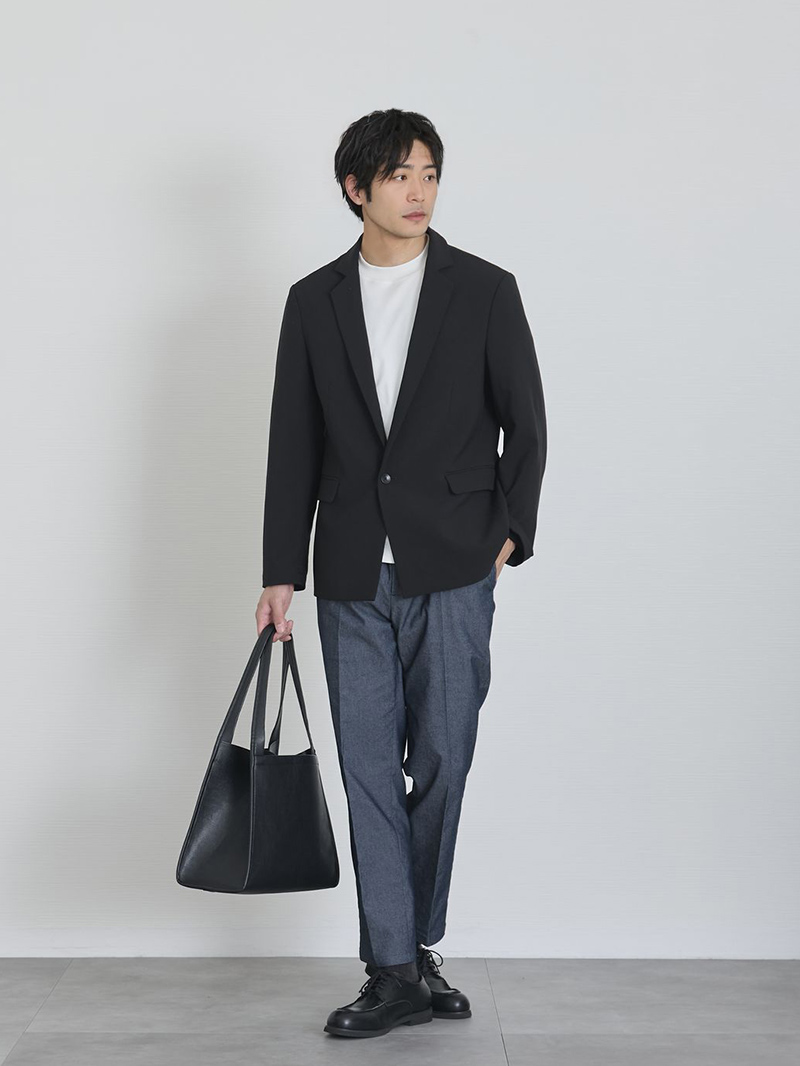 仕事終わりのデートは、白Tとデニスラでラフさを出しつつ、黒ジャケットの1ボタン留めで“ちゃんと感”を。