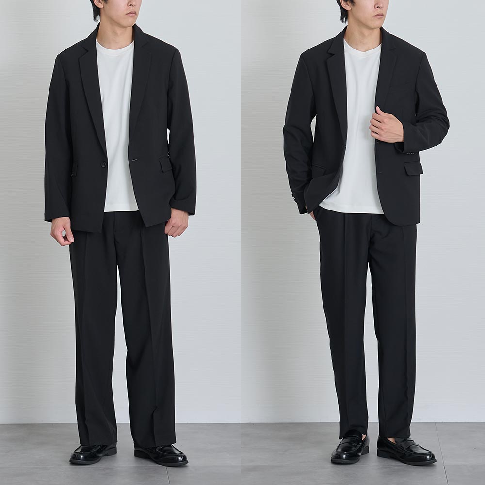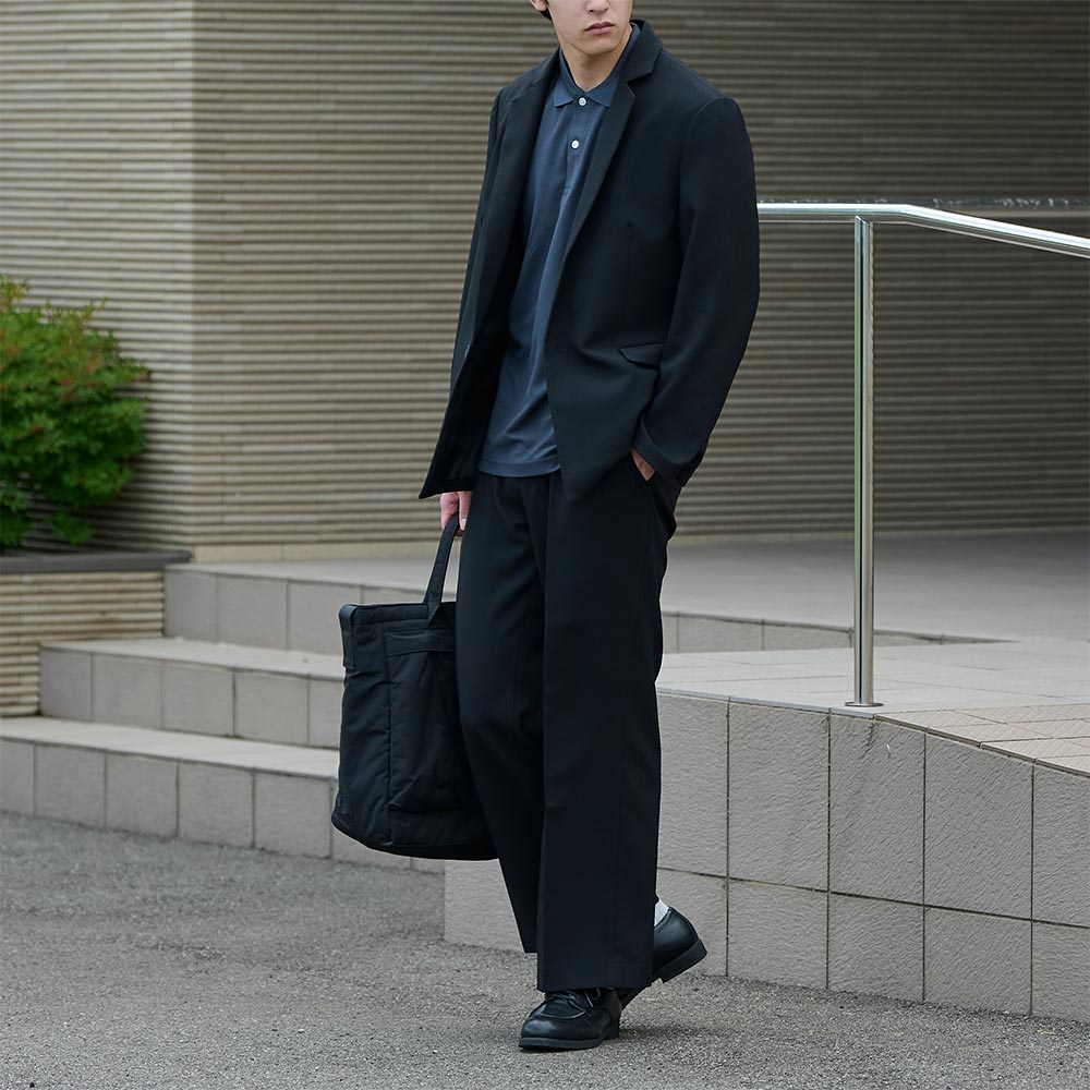 黒スラックスと同色系でまとめて落ち着き感を保ちつつ、ジャケットを脱いでもサマになるのが嬉しい。