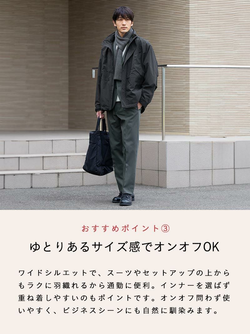 アイテム説明 機能性とデザイン性を両立オンオフ着られる万能アウター テクニカル2WAYマウンテンパーカーの おすすめポイント 01. 撥水&裏地メッシュで快適仕様 撥水加工で急な雨にも対応し、ストレッチの効いたメッシュ裏地が湿気を逃してイヤな蒸れを軽減。 移動が多い日やアクティブな予定があってもストレスフリーな着心地を実現します。 02. 1枚で「印象チェンジ」できる フードの出し入れと裾のドローコードで、シーンに合わせてスタイル調整が可能。 カジュアルからキレカジまで、その日の気分や予定に合わせて印象を変えられるのが魅力です。 03. ゆとりあるサイズ感でオンオフOK ワイドシルエットで、スーツやセットアップの上からもラクに羽織れるから通勤に便利。 インナーを選ばず重ね着しやすいのもポイントです。オンオフ問わず使いやすく、ビジネスシーンにも自然に馴染みます。 昨年モデルからアップデート 袖周り・生地をスマートかつ快適に レビューやアンケートの声をもとに、前作からアップデート。 袖口のマジックテープを目立ちにくくスマートに仕上げ、さらに生地を改良することで着心地の良さを追求しました。 サイズ・素材 肩幅 身幅 袖丈 着丈 S 50 63 59.5 70 M 51.5 65.5 59.5 72 L 54 67.5 61 74 XL 56 69 62 76.5 ※表記サイズは実寸であり、個体差により誤差が生じる場合があります。 ※商品によっては洗濯タグにヌード寸法が記載されておりますが、実寸とは異なります。 伸縮性 あり ややあり なし 厚み 厚手 普通 薄手 透け感 あり ややあり なし 洗濯 洗濯OK ネット使用 手洗いのみ 表地 ポリエステル100% 裏地 ポリエステル100% 生産国 中国 表示を隠す サイズにお悩みですか? AIに適正サイズを聞く 返品・交換は無料で安心 ご自宅でじっくりご試着いただけます。合わなければ送料負担なく返品できます。あなたにぴったりの一着と出会えるよう、お手伝いいたします。 コーディネート Model : 179㎝ / 66㎏ / L / ブラック着用 モノトーンで仕上げる、大人のカジュアル カジュアルコーデはモノトーンでまとめると大人っぽく仕上がります。 さらに、アウターのジップは開けて着るのもおすすめです。 縦のラインが強調されスタイルアップにも繋がりますよ。 ハイゲージシルクタートルニット CHECK CODEストレート ウィンター CHECK リバーシブルレザーベルト CHECK HARUSAKU 奈良産 プレーンリブソックス CHECK Model : 179㎝ / 66㎏ / L / ブラック着用 オフィスでも活躍する機能派アウター 急な天候の変化にも対応できる機能性アウターは、通勤や外回りなどのビジネスシーンで活躍します。 ややゆとりのあるシルエットで、ジャケットの上からでも快適に羽織れますよ。 CODEジャケット ウィンター CHECK ハイゲージシルクニット CHECK CODEテーパード ウィンター CHECK アゼループマフラー CHECK Model : 179㎝ / 66㎏ / L / ブラック着用 黒を選べばどんなスタイルにも馴染む マウンテンパーカーは休日のカジュアルコーデにも◎。 デニムスラックスやチノパンなど幅広くコーデを楽しめます。 特にブラックは合わせる色を選ばず、悩まずに着回せるのも嬉しいポイントです。 コットンカシミヤ タートルネックニット CHECK CODEテーパード デニム CHECK リバーシブルレザーベルト CHECK コートレザースニーカー CHECK Model : 179㎝ / 66㎏ / L / ベージュ着用 大人世代のためのラフスタイル カジュアルなアウターにはストレートデニムを合わせたラフな着こなしもおすすめ。 細すぎず程よくゆとりのあるデニムなら、大人世代にも馴染みます。 インナーを黒で引き締めれば、ラフになりすぎず安心です。 ハイゲージシルクニット CHECK ストレートジーンズ CHECK スマートスニーカー CHECK REGiSTA撥水加工ショルダーバッグ CHECK Model : ベージュ着用 マウンパで叶える大人の休日スタイル シンプルな白のニットにベージュのアウターを羽織った休日コーデ。 落ち着いたパンツでバランスをとり、リラックス感のある大人のスタイルに仕上げました。 ハイゲージシルクニット CHECK CODEワイド ウールブレンド 通年用 CHECK リバーシブルレザーベルト CHECK HARUSAKU 奈良産 プレーンリブソックス CHECK Model : 179㎝ / 66㎏ / L / ベージュ着用 明るいベージュで抜け感をプラス 普段のコーデで黒系が多い方には、ベージュもおすすめ。 明るいトーンがコーディネートに抜け感をプラスし、柔らかく上品な印象に仕上がります。 シーンに合わせて色違いで揃えても便利ですよ。 コットンカシミヤ クルーネックニット CHECK CODEテーパード ウィンター CHECK オールブラックキャンバストートバック CHECK リバーシブルレザーベルト CHECK スタッフコーディネート もっと見る スタイリストの解説
