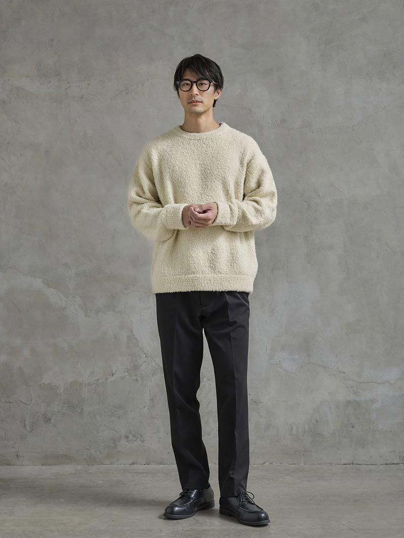テーパードパンツを合わせ、トップスに少しボリュームを持たせれば、リラックス感のある大人の着こなしになります。