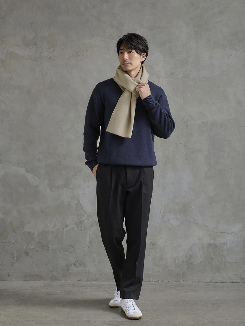 上質なネイビーのニットがさりげなく周りと差をつけ、首元のベージュのマフラーがこなれたおしゃれ感をプラスします。