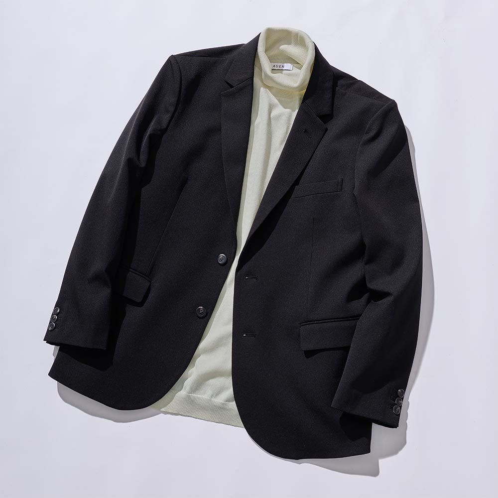 冬用テーラードジャケットと、ハイゲージタートルニットを組み合わせたオフィスカジュアル2点セット。