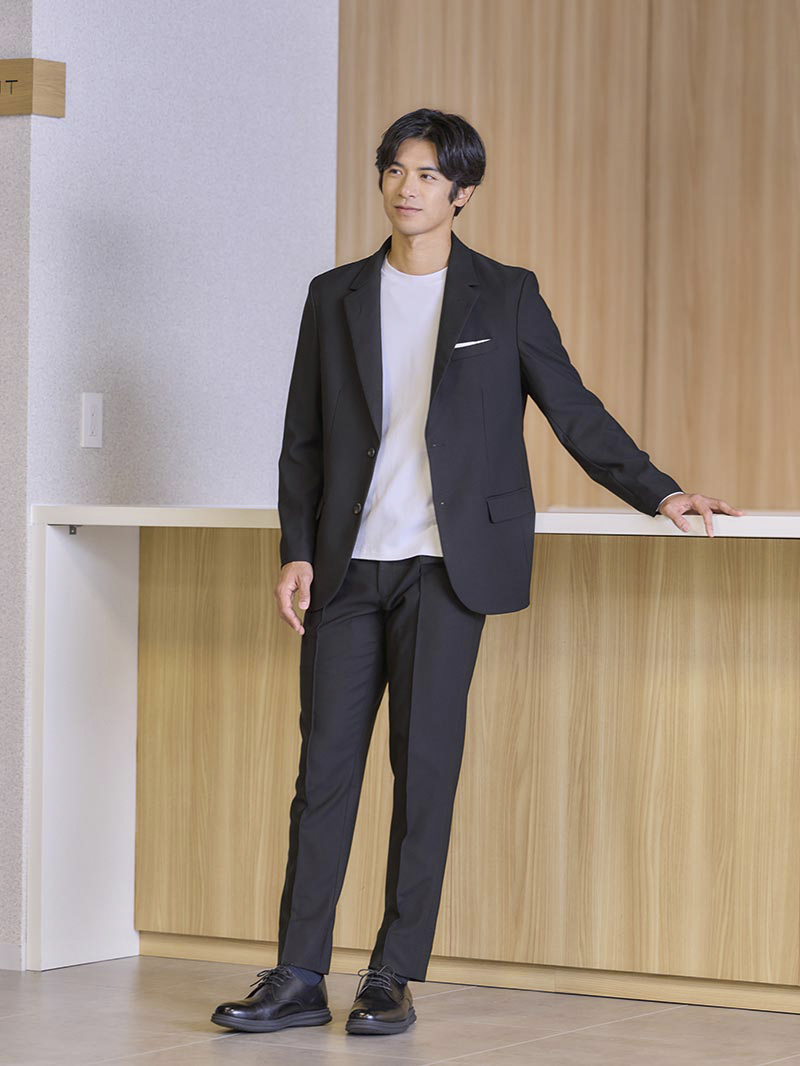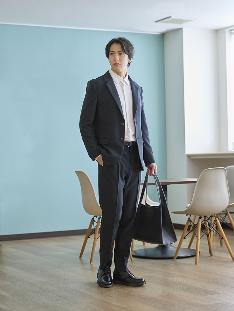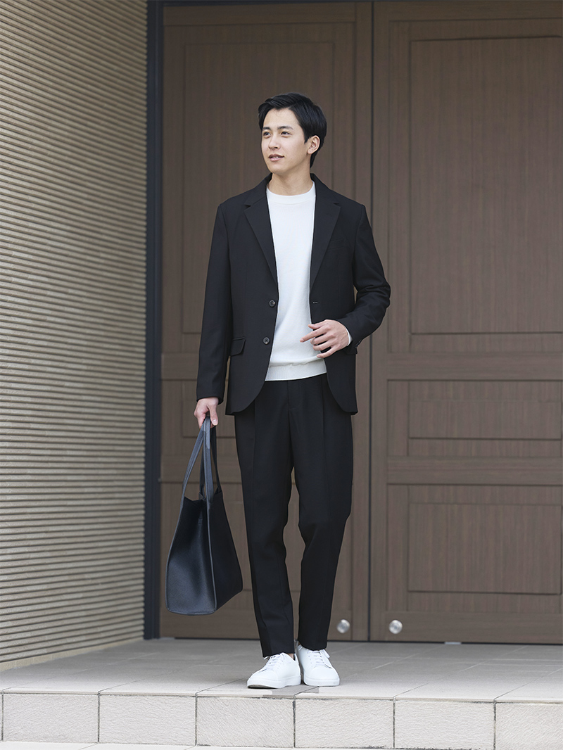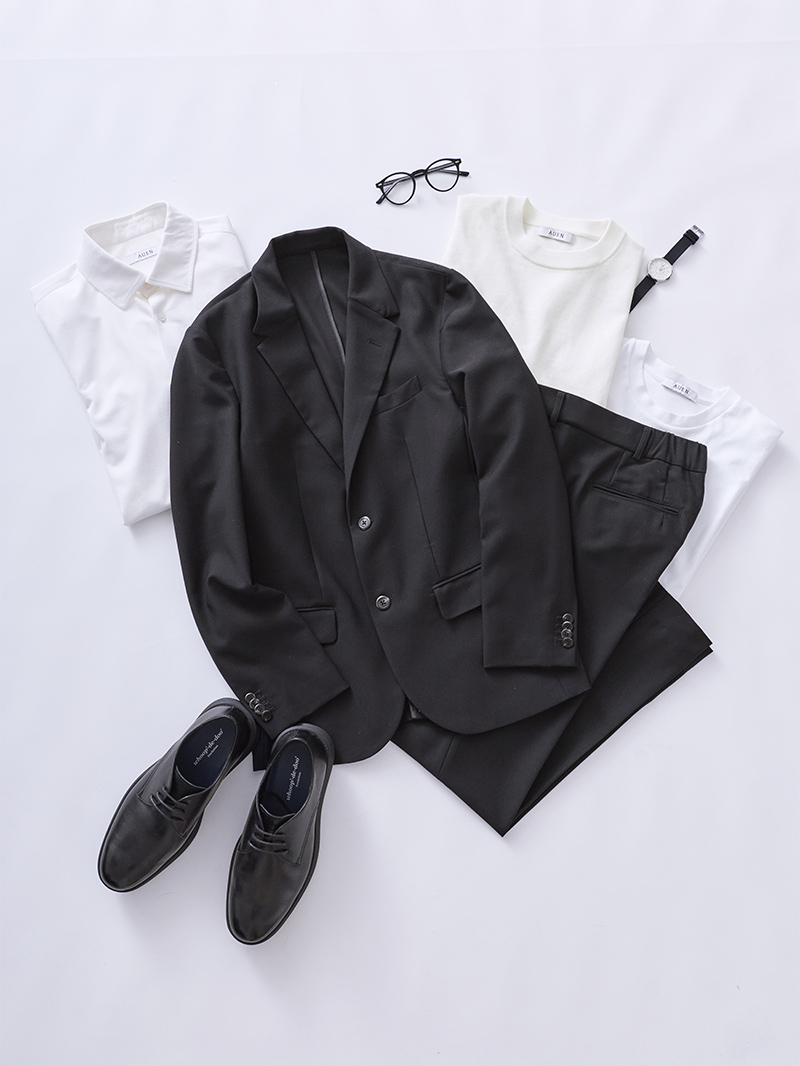 セットアップにシャツを合わせるだけで、グンと清潔感のある印象に。