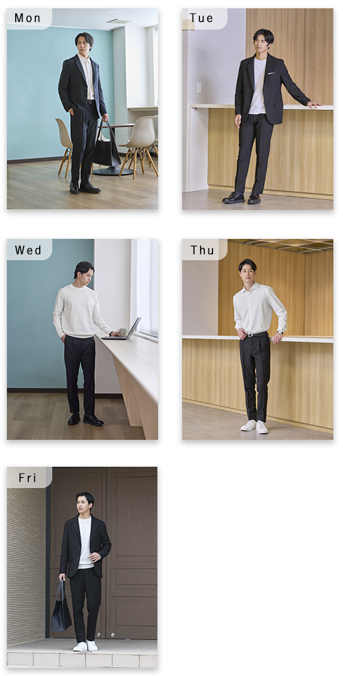 その日の予定に合わせて選ぶだけで、平日の着回しに迷わず、好印象なスタイルが整います。