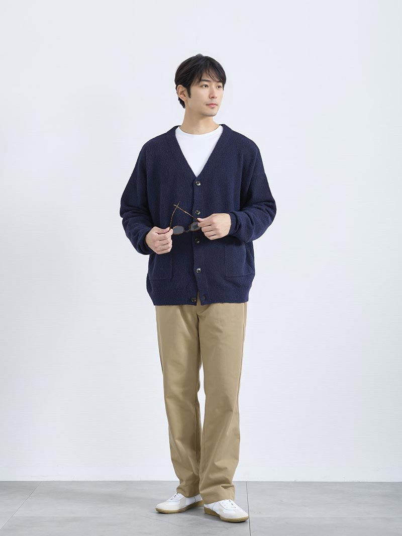 アイテム説明 カーディガンが苦手な人にも挑戦してほしいメランジカーディガン 開きすぎないVネックと高めの第一ボタンで上品さをキープ。 ドロップショルダーでリラックス感を持たせながらも、だらしなく見えない仕上がりです。 ふんわり軽いメランジニット 空気を含む編み地は軽量であたたかく、ふわっとした見た目が優しいイメージを与えます。 サイズ・素材 肩幅 身幅 袖丈 着丈 S 61 62.5 50.5 62.5 M 63 64.5 52 65 L 65.5 67 52.5 66 XL 68 70 53 69.5 ※表記サイズは実寸であり、個体差により誤差が生じる場合があります。 ※商品によっては洗濯タグにヌード寸法が記載されておりますが、実寸とは異なります。 伸縮性 あり ややあり なし 厚み 厚手 普通 薄手 透け感 あり ややあり なし 洗濯 洗濯OK ネット使用 手洗いのみ 表地 ポリエステル81%アクリル15%ポリウレタン4% 裏地 なし 生産国 中国 禁止事項 乾燥機使用×日向干し×漂白剤使用× 表示を隠す サイズにお悩みですか? AIに適正サイズを聞く 返品・交換は無料で安心 ご自宅でじっくりご試着いただけます。合わなければ送料負担なく返品できます。あなたにぴったりの一着と出会えるよう、お手伝いいたします。 コーディネート Model : 179㎝ / 66㎏ / L/ チャコール着用 ニットカ―デでもきちんと見えコーデ ゆったりとしたフォルムのカーディガンを、大人らしくすっきりと着こなすには、シンプルなカットソーがおすすめ。 オフィスにも使えるセンタープレス入りのパンツで、端正な印象をプラスして子供っぽさを払拭します。 ハイゲージ長袖カットソー CHECK CODEストレート ウールブレンド 通年用 CHECK スウェードレザースニーカー CHECK リバーシブルレザーベルト CHECK Model : 179㎝ / 66㎏ / L/ チャコール着用 男らしいカジュアルスタイル デニムを合わせたワイルドな印象に、起毛カーディガンのやわらかさが加わり、男らしさと優しさを両立。 モノトーンでまとめてクールに仕上げたこのスタイルは、デートや大人のカジュアルシーンにもぴったりです。 タウンユースマウンテンパーカー CHECK ハイゲージ長袖カットソー CHECK ストレートジーンズ CHECK リバーシブルレザーベルト CHECK Model : 179㎝ / 66㎏ / L/ ネイビー着用 快適に過ごせるオフィカジコーデ オフィスにも馴染む定番カラーは、程よいリラックス感ときちんと感を意識することが肝心。 明るめネイビーは、地味すぎず着こなしやすい一枚です。 合わせ方次第で幅広く使えるアイテムは、大人の強い味方です。 バンドカラーシャツ CHECK CODEテーパード ウィンター CHECK スウェードレザースニーカー CHECK リバーシブルレザーベルト CHECK Model : 179㎝ / 66㎏ / L/ ネイビー着用 秋の休日お出かけスタイル 快適な休日服の正解は、こんなチノパンスタイル。 ゆったりとしたカーディガンを合わせてリラックスした1日を過ごしたい。 ネイビーカラーは合わせる色を選ばない万能アイテムです。 ハイゲージ長袖カットソー CHECK テーパードチノパンツ CHECK コートレザースニーカー CHECK ボストンサングラス 調光レンズ CHECK スタッフコーディネート もっと見る