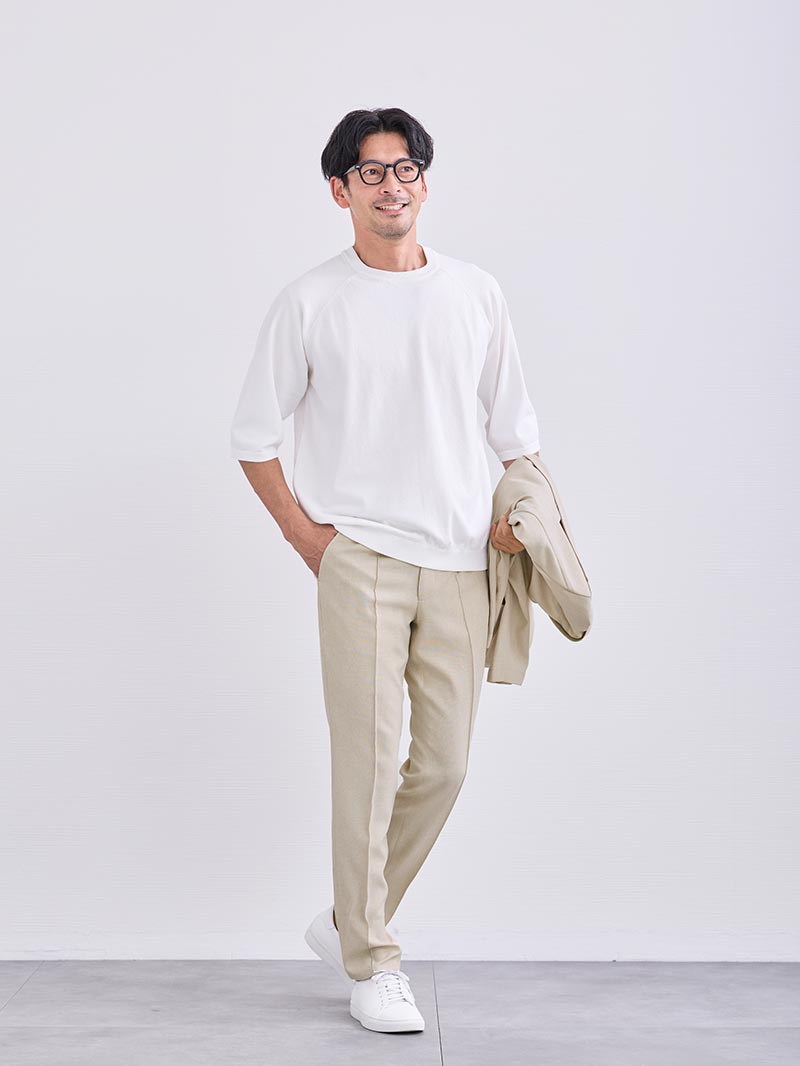 白ニットにベージュのスラックスを合わせ、シンプルながらも上品なカジュアルスタイル。