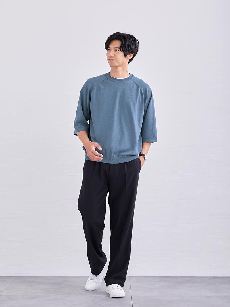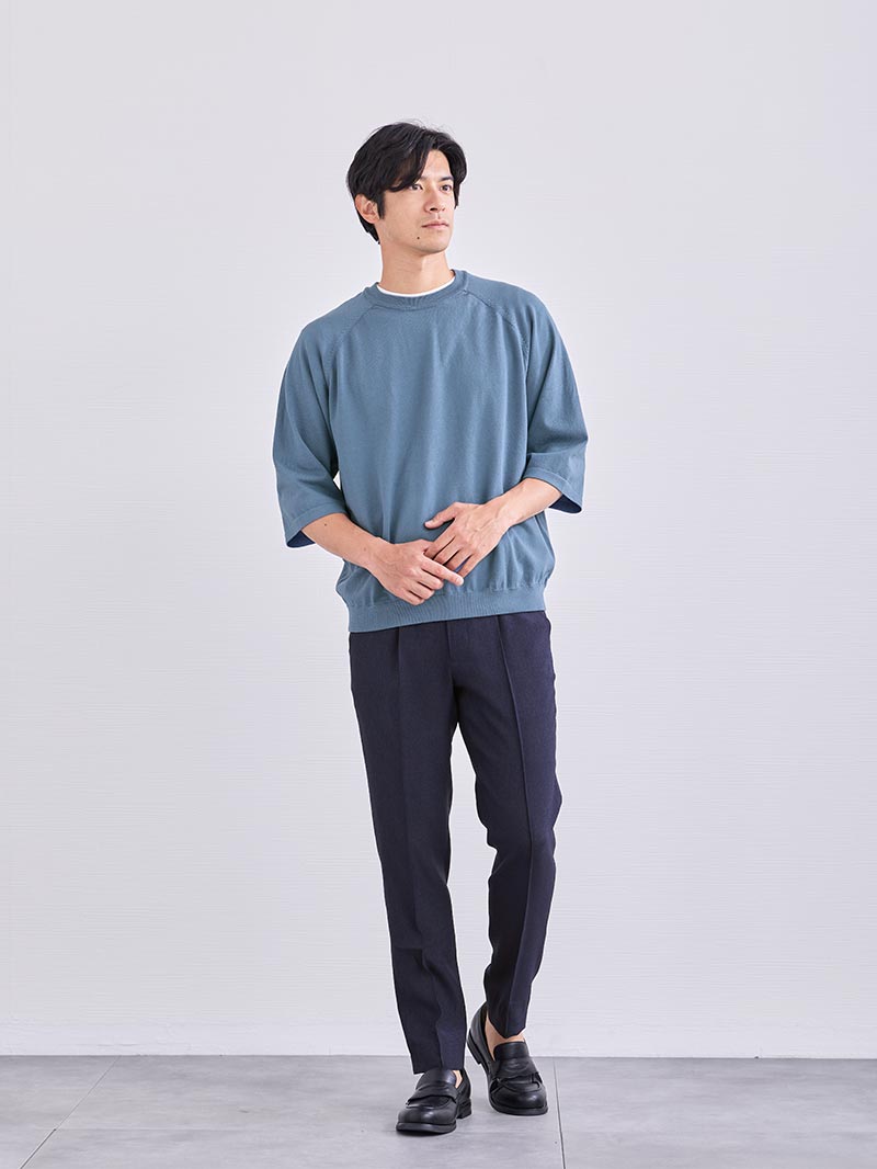 インディゴブルーのニットにネイビーのスラックスを合わせ、爽やかで洗練された印象に。
