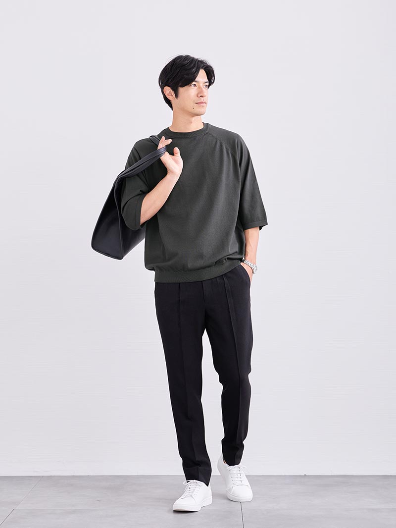 チャコールのニットと黒のスラックスで、シンプルでありながらも深みのあるコーディネート。
