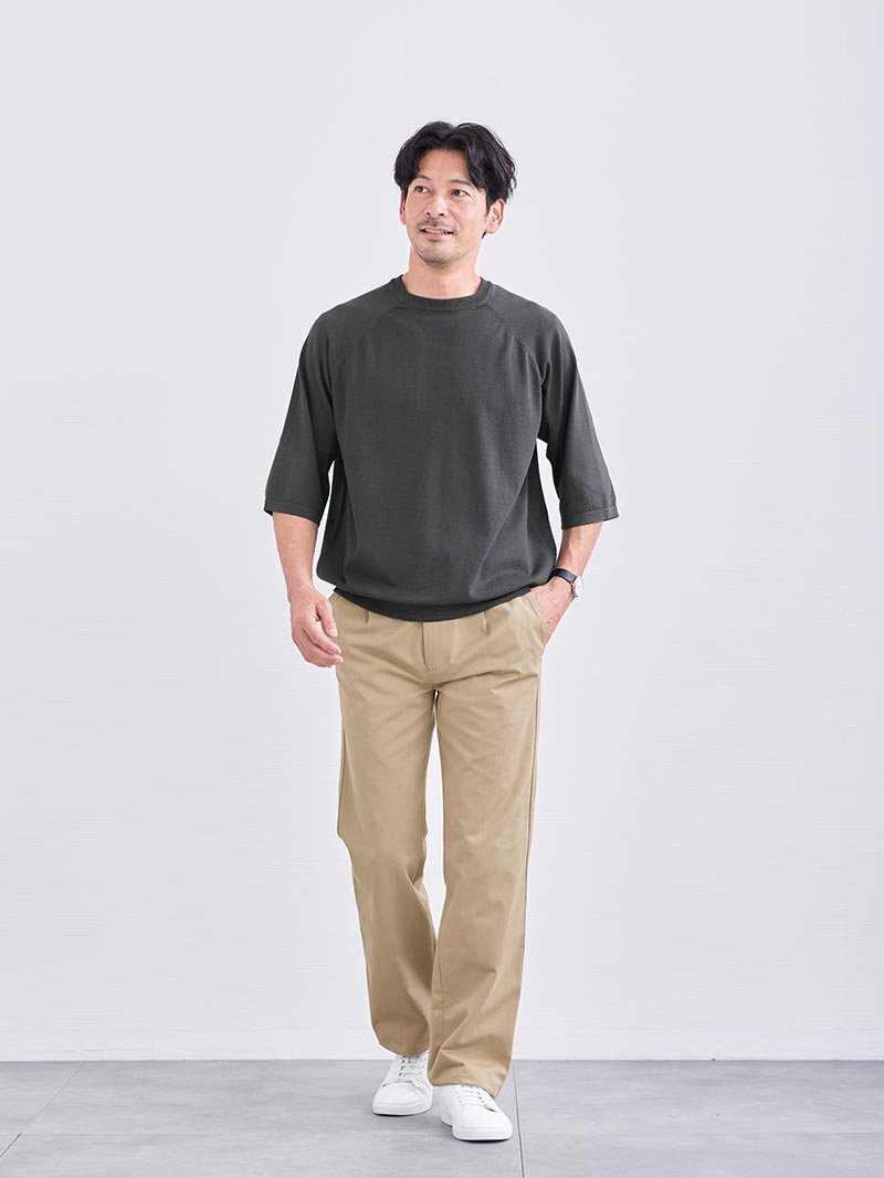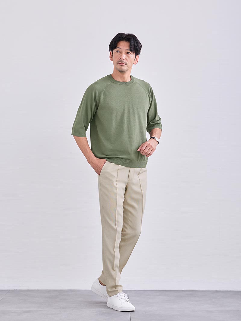グリーンのニットにベージュのスラックスを合わせ、季節感たっぷりのナチュラルなコーディネート。