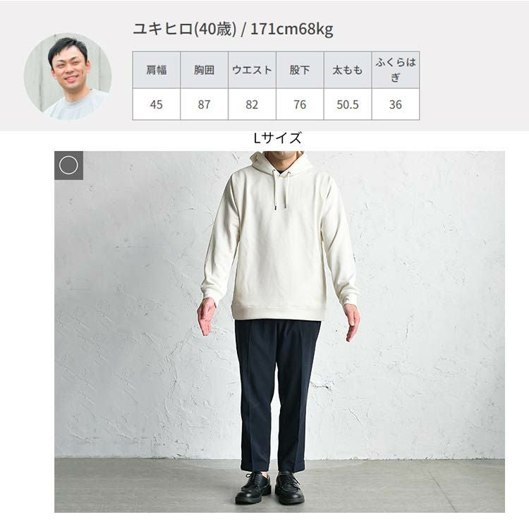 アイテム説明 毎日の街着にちょうどいい“ドレス”パーカー ポリエステル主体の滑らかな光沢に、コットンのやわらかさをブレンド。 フード立ちにこだわり、フードまできちんと仕立てたパーカーです。 光沢とハリのある生地 繊維の細いポリエステルを使った光沢とハリ感がある生地。 コットンも18%混紡することで着心地の良さも両立。 LIGHT TECHインナーとは、太陽光・室内灯の近赤外線と、身体から放射される遠赤外線を熱に変える発熱素材を使用した機能性インナーです。 着心地の良い裏起毛によって、より暖かさアップ。 また、ネックラインと袖の長さにこだわり、襟元・袖口からインナーが見えないように設計。 ニット・シャツなど、どんなトップスにも合わせることができます。 好みで選べる2タイプ首元まで暖かいクルーネックシャツと好相性のVネック LIGHT TECH クルーネックインナーTシャツ CHECK LIGHT TECH VネックインナーTシャツ CHECK サイズ・素材 肩幅 身幅 袖丈 着丈 S 42.5 52 58 65 M 45 54.5 58.5 67.5 L 47 57 59.5 69 XL 50.5 60.5 60.5 72 ※表記サイズは実寸であり、個体差により誤差が生じる場合があります。 ※商品によっては洗濯タグにヌード寸法が記載されておりますが、実寸とは異なります。 伸縮性 あり ややあり なし 厚み 厚手 普通 薄手 透け感 あり ややあり なし 洗濯 洗濯OK ネット使用 手洗いのみ 表地 本体:ポリエステル82% 綿18% リブ:ポリエステル100% 裏地 なし 生産国 中国 表示を隠す サイズにお悩みですか? AIに適正サイズを聞く 返品・交換は無料で安心 ご自宅でじっくりご試着いただけます。合わなければ送料負担なく返品できます。あなたにぴったりの一着と出会えるよう、お手伝いいたします。 コーディネート Model : 179㎝ / 66㎏ / L/ グレージュ着用 テーパードパンツできちんと感を演出 休日スタイルの定番パーカスタイルを、いつものラフなワンマイル的の着こなしだけでなく、 キレイめのテーパードパンツに合わせればきちんと感もプラスされ、着こなしの幅がグンと広がります。 CODEロングスリーブTシャツ CHECK CODEテーパード デニム CHECK Uチップシューズ CHECK Model : 179㎝ / 66㎏ / L/ グレージュ着用 くすみカラーをブラックで整える シックな印象のグレージュとブラックで、大人シックな着こなし。 足元までブラックにすることで足長効果もプラス、スタイルアップを狙いましょう。 カジュアル通勤OKな職場にも最適の、きちんと感あるスタイルです。 CODEロングスリーブTシャツ CHECK CODEテーパード CHECK Model : 179㎝ / 66㎏ / L/ オフホワイト着用 カジュアルだけど清潔感はキープ 清潔感を引き立てるオフホワイトのパーカーは、表面が滑らかでカジュアルの一歩上をいく仕上がり。 ホワイト×ブラックの配色が、ラフすぎない大人のカジュアルを完成させます。 ストレートジーンズ CHECK Model : 179㎝ / 66㎏ / L/ オフホワイト着用 きれいめパンツで作る上品オフスタイル ウォーム感のあるチャコールグレーのパンツは、程よい素材感が、パーカのボリュームにピッタリです。 パンツ、パーカともに1サイズアップをチョイスして。 程よく緩やかに着こなすのが今どきっぽく見せるコツです。 CODEストレート ウィンター CHECK Model : 179㎝ / 66㎏ / L/ ネイビー着用 脱・ラフ見え品よく魅せるパーカーコーデ 胸元からチラリと見せる白Tが、無難に見えがちな着こなしに垢抜けた印象をプラス。 カジュアルだけでなく、テーパードパンツを合わせていつもよりスッキリしたビジカジ風な着こなしにも◎ CODEロングスリーブTシャツ CHECK CODEテーパード CHECK Model : 179㎝ / 66㎏ / L/ ネイビー着用 重たく見せない秋冬カジュアルスタイル アメカジ感高めで着こなしたい方は、サイズをあげてゆるりとしたラインで着るのがおすすめです。 ブルーデニムと合わせた休日の王道スタイルは、スニーカーでスポーティに仕上げるのがおすすめです。 CODEロングスリーブTシャツ CHECK ストレートジーンズ CHECK スタッフコーディネート もっと見る