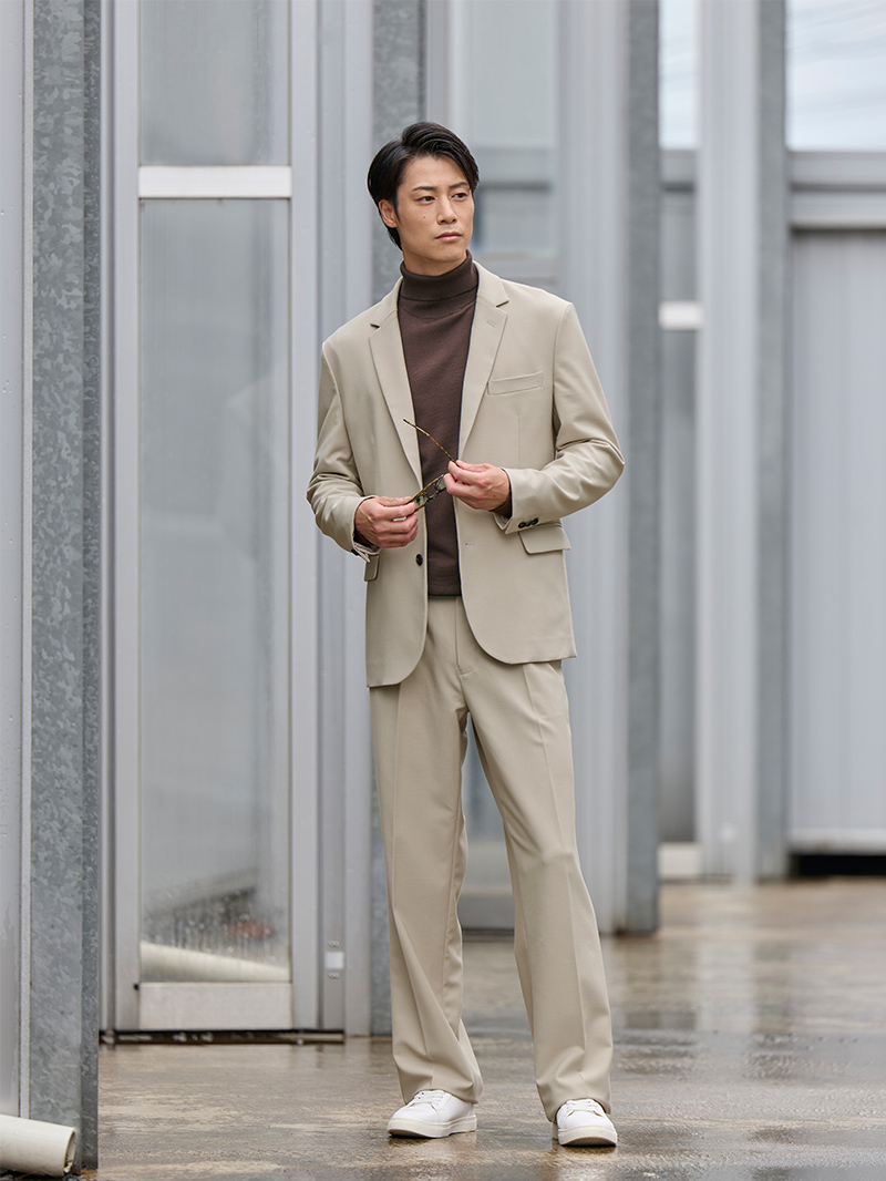 柔らかいベージュのセットアップが軽やかで親しみやすく、堅苦しさを感じさせない秋らしい温かみを演出。