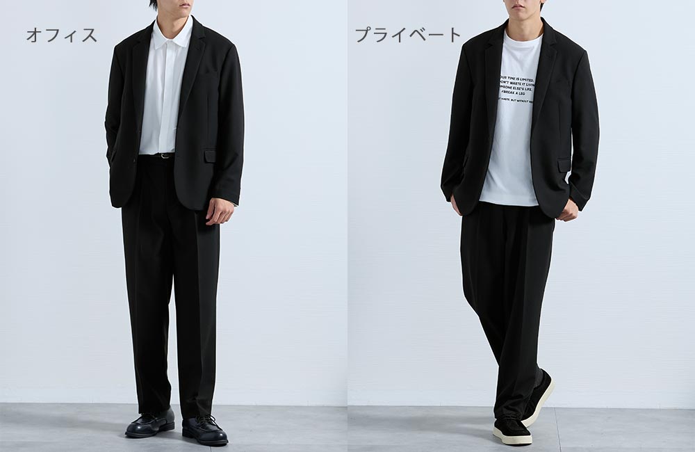 ジャケットを脱いでもオールブラックでかっこよく決まるスタイルです。