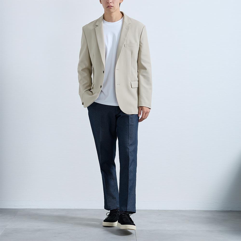 デニム素材のスラックスを合わせることで、きちんと感がありながらも堅すぎない雰囲気に仕上がります。
