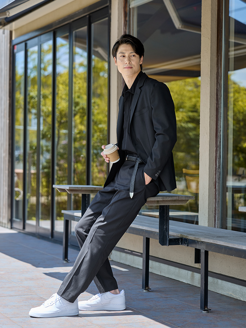 仕事の合間や仕事後の寄り道ではベルトを垂らし遊び心を加えると、堅くなりすぎず抜け感のあるコーデに。