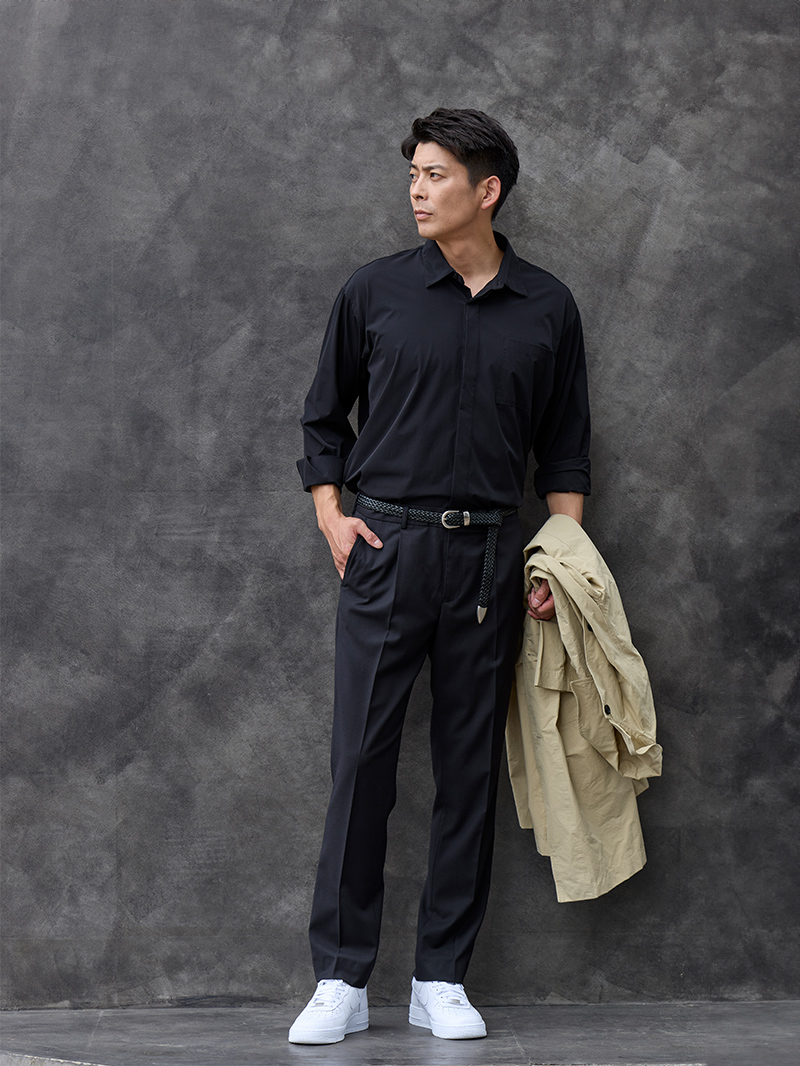 シャツは腕まくりをして抜け感をだし、白スニーカーでモノトーンの中にも軽やかさを出しました。