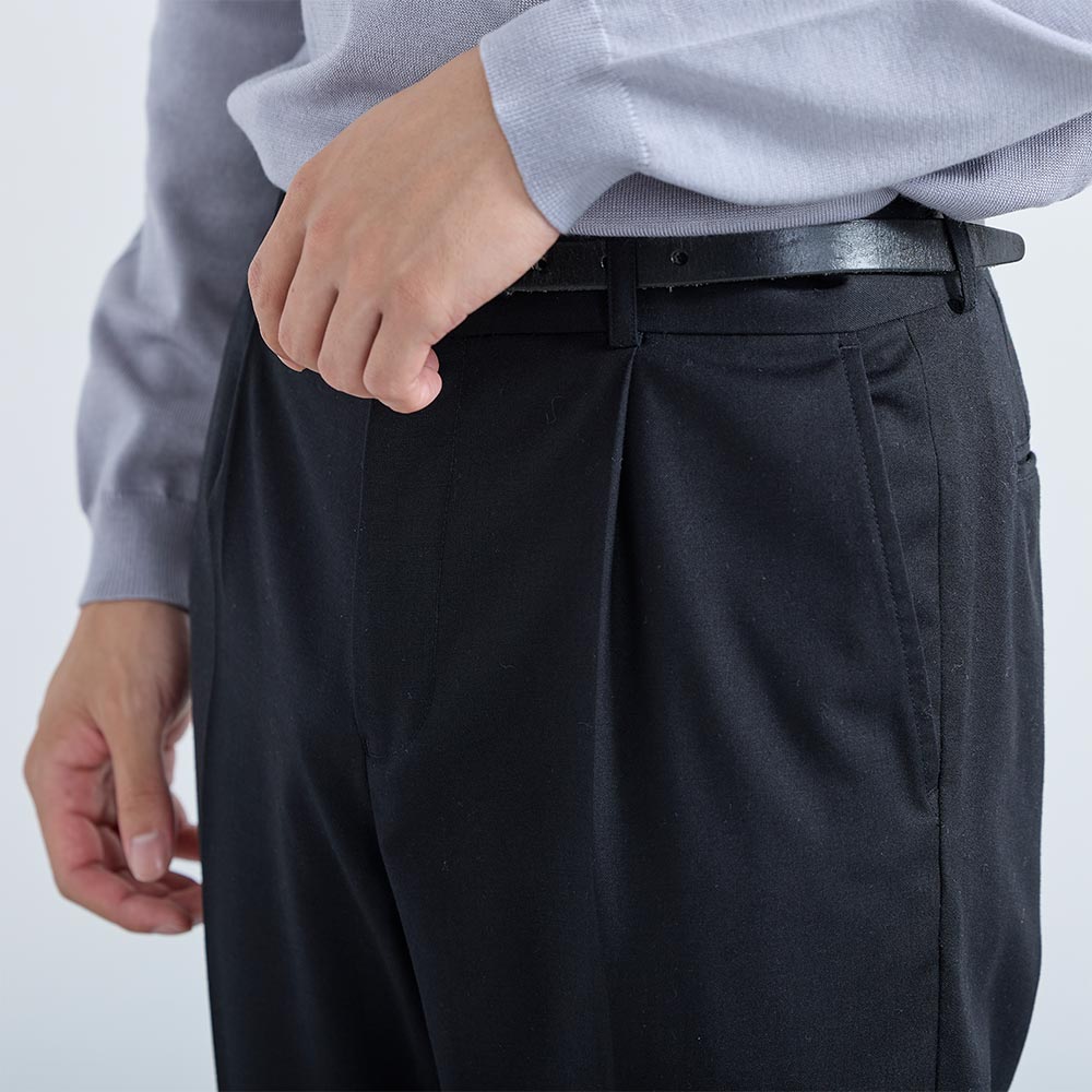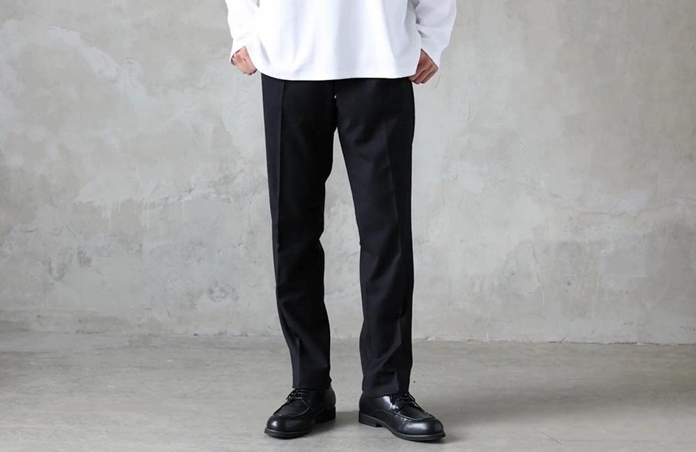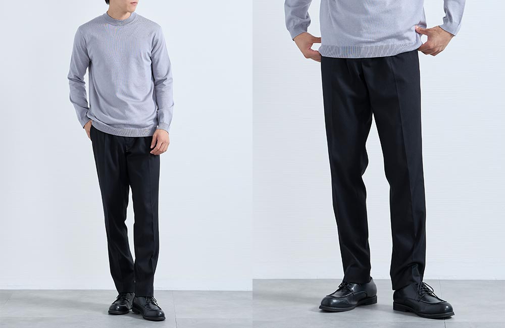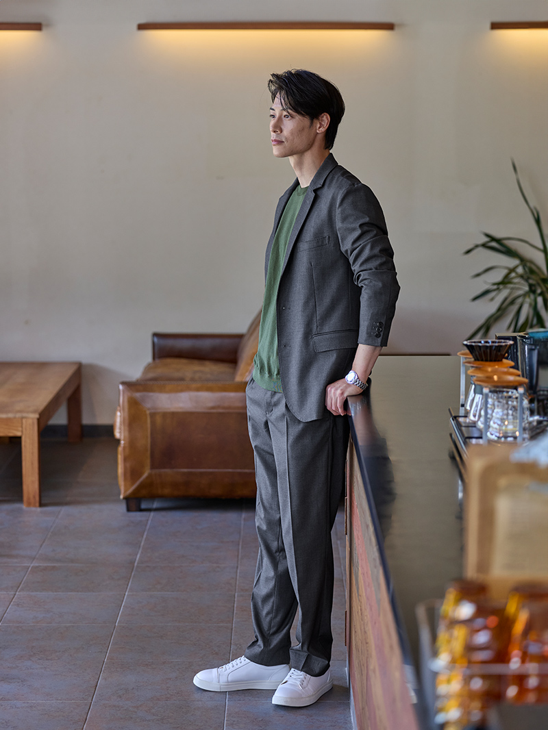 ボトムスはセンタープレス入りのテーパードパンツに革靴をあわせれば、年相応のスタイルに。