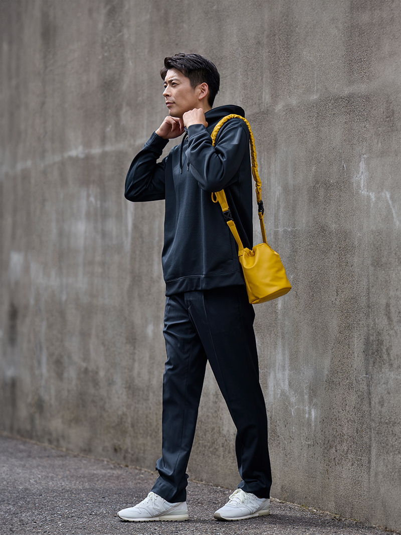色はネイビーで統一し、ボトムはキレイめ感のあるテーパードパンツをあわせれば、統一感のある大人っぽいパーカーコーデが仕上がります。