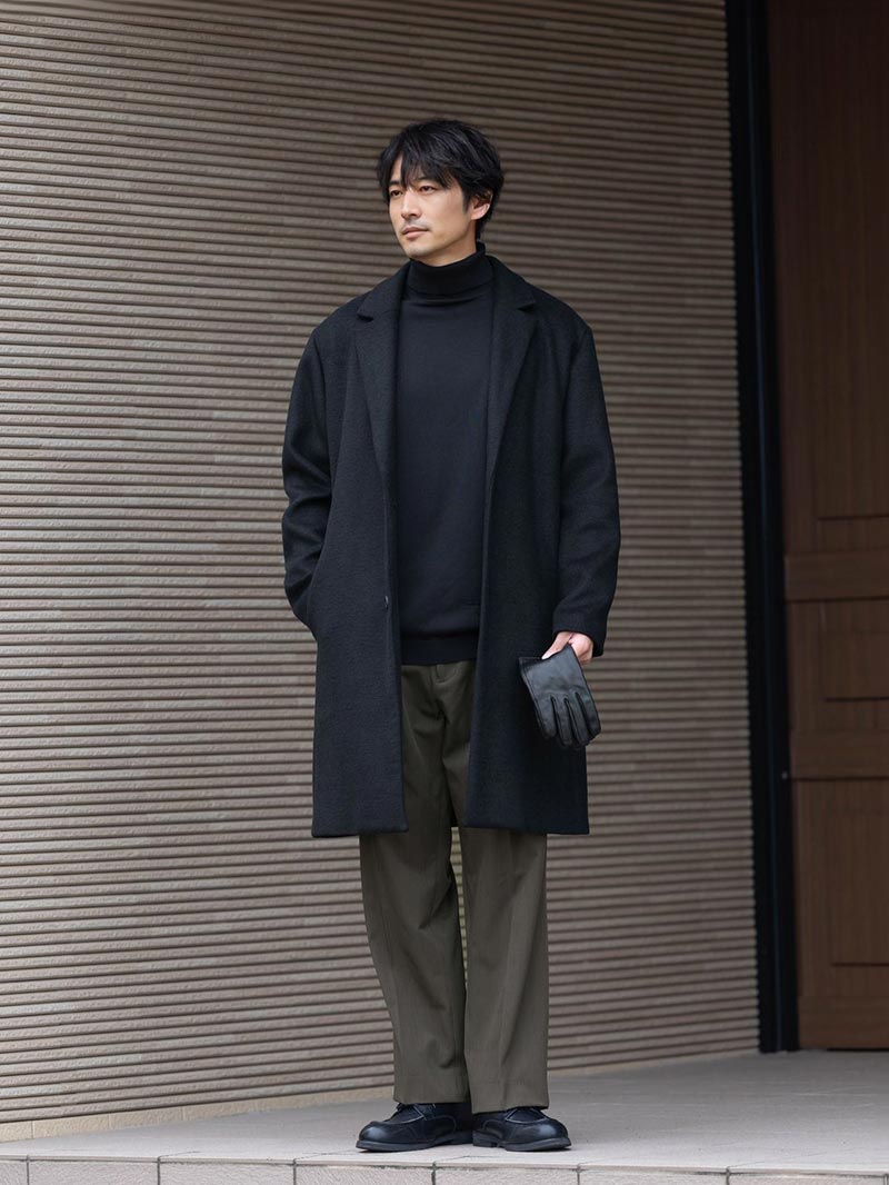 ロングコートを羽織るだけで、シンプルながら信頼感のある大人スタイルに。