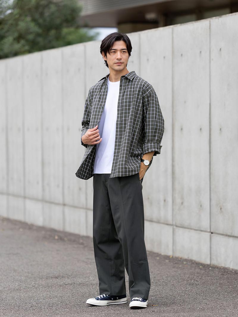 チャコールのボトムは、同じ色を使った柄のチェックシャツと合わせると、ごちゃつかずまとまりのある印象に。