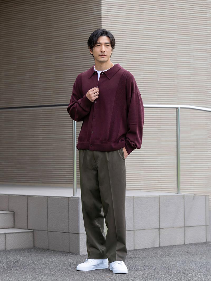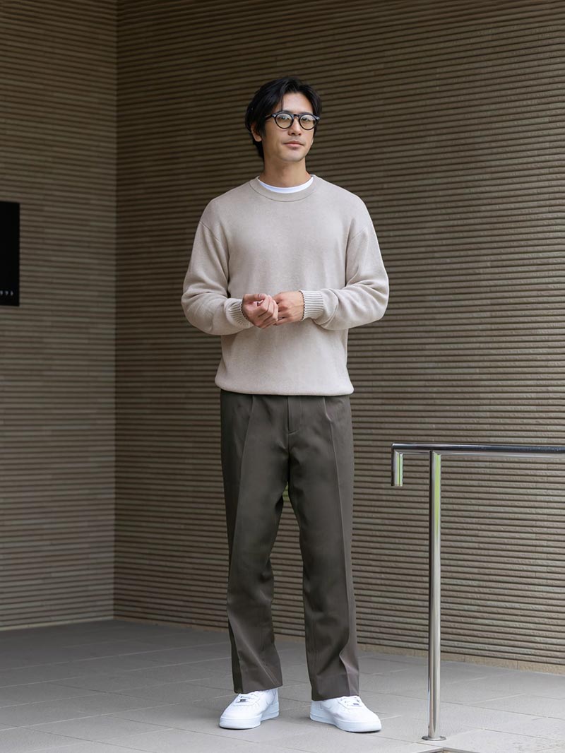 チャコールのニットに白Tシャツをインナーとして合わせることで、首元に変化を与えることができ、シンプルながらもこなれた着こなしに仕上がります。