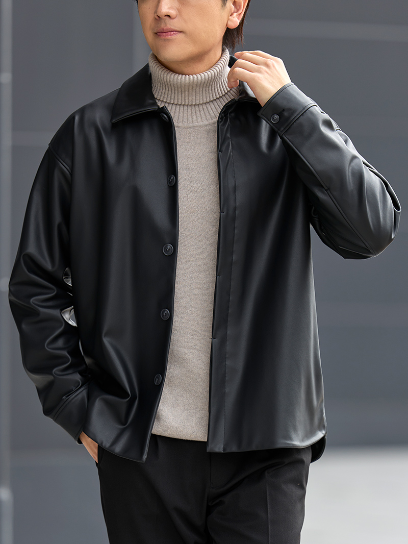 毛足のあるニットにフェイクレザーのアウターを合わせて、素材のコントラストを楽しむ大人のスタイル。