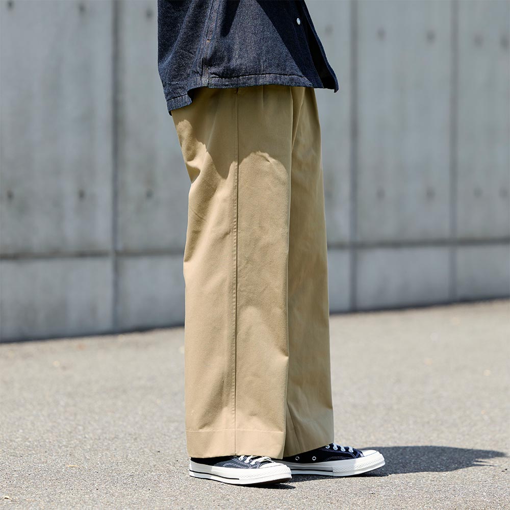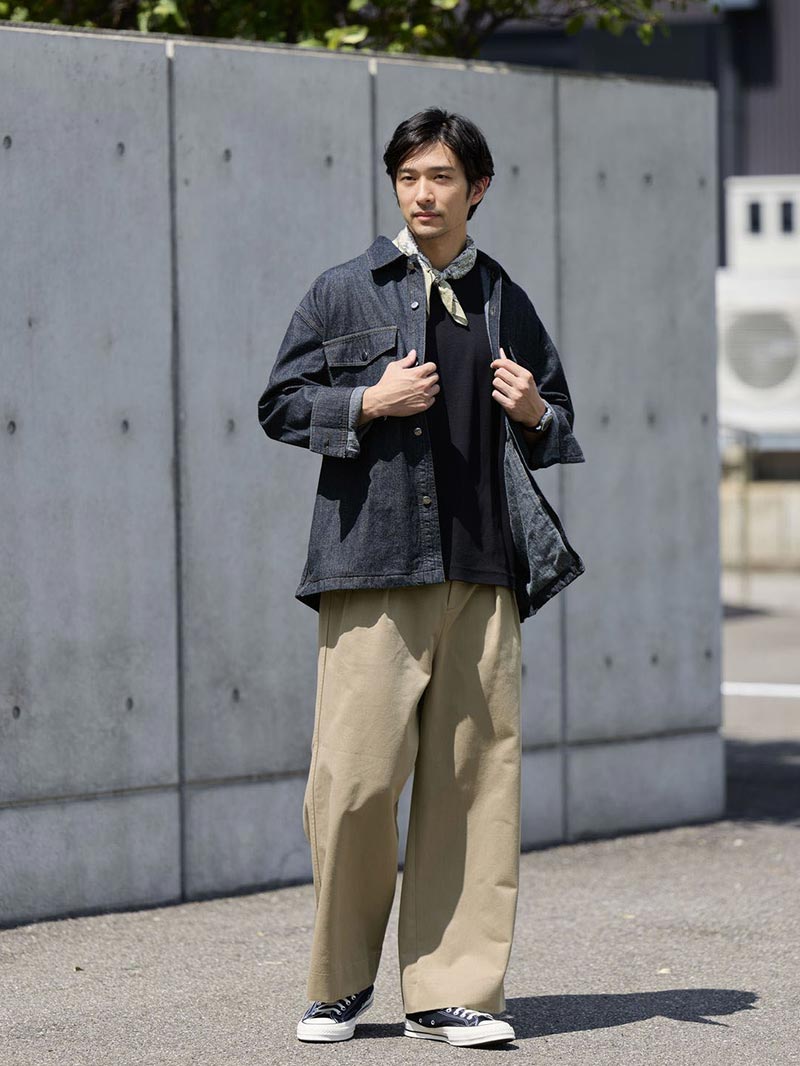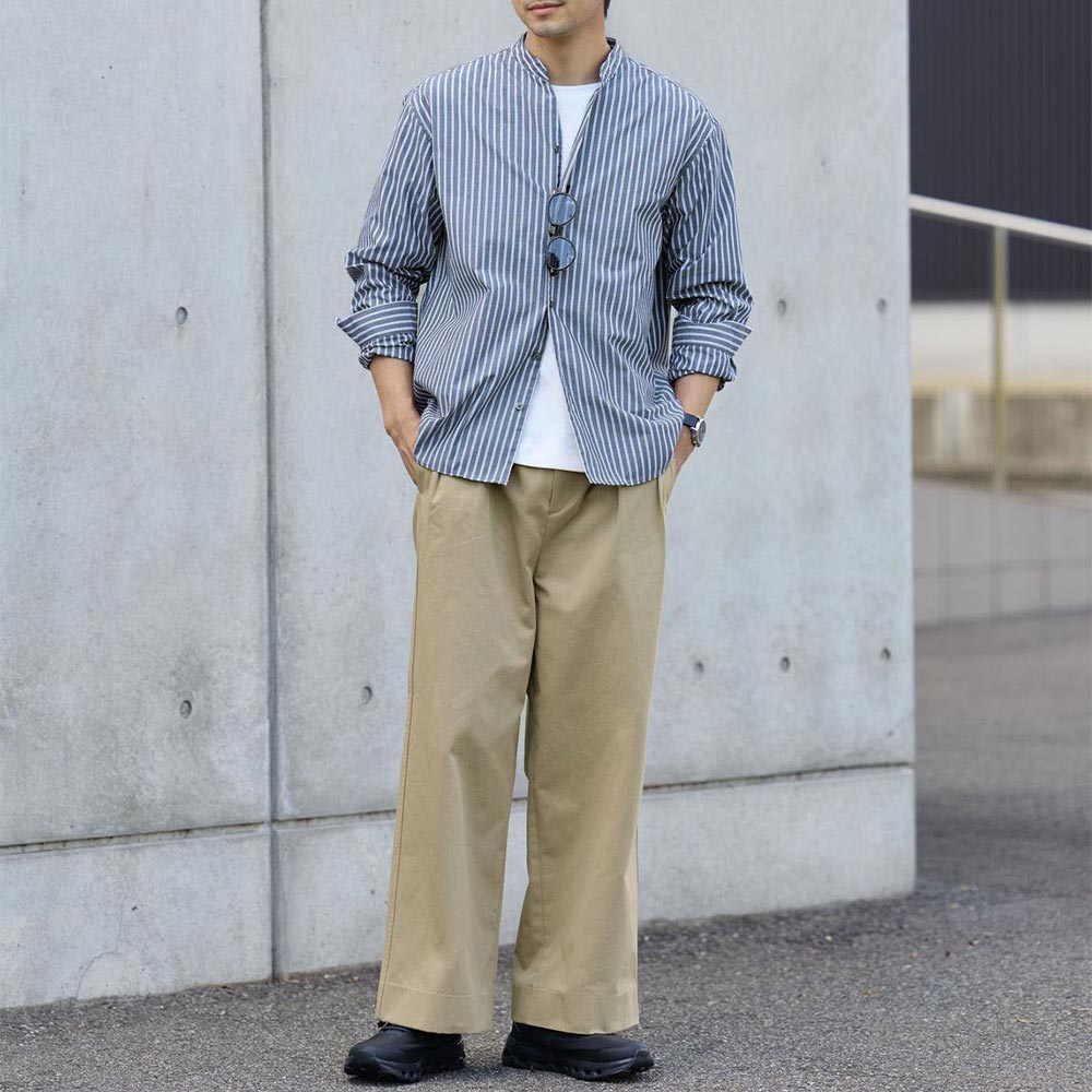 アイテム説明 余裕をまとう、動けるワイド 動きやすさと上質感を同時に叶える、ツータック立体×テーパード美脚。柔らかい余裕を纏い、1ランク上の毎日へ。 もっと見る 大人の余裕を感じるシルエット 太もも〜膝の可動域を解放しながら、見た目はスッと端正。ストレスフリーなのに手抜き感ゼロ、これが大人の余裕です。 シワになりにくいので清潔感が持続 毎日穿けるタフな生地でシワになりにくいです。 ツータックが織りなす立体美 フロントに刻んだ 2 本タックが腰まわりの圧迫を軽減し、奥行きのある表情をプラス。 ほど良い陰影が上品さを生み、ビジネスカジュアルの格を高めます。 ダブルループでひと差し違い ベルトループを二重に重ねたダブルループ仕様。耐久性を高める実用性はもちろん、視線を引くミニマルディテールとしてコーディネートのアクセントに。 体型を選ばず、シルエットが決まる ヒップと太ももを拾わないワイド設計に、裾へ向かう緩やかなテーパードライン。どんな体型でも脚をすっきり長く見せ、自然体の“かっこよさ”を引き出します。 同素材で揃えるテーパードもラインナップ テーパードチノパンツ CHECK サイズ・素材 ウエスト 股上 股下 ヒップ もも幅 すそ幅 S 79~86 35.5 62 107 34 26.5 M 82~90 36 64 110 34.5 27 L 84.5~94 36.5 66.5 113 36 27.5 XL 89.5~98 37 68 116 36.5 28 ※表記サイズは実寸であり、個体差により誤差が生じる場合があります。 ※商品によっては洗濯タグにヌード寸法が記載されておりますが、実寸とは異なります。 伸縮性 あり ややあり なし 厚み 厚手 普通 薄手 透け感 あり ややあり なし 洗濯 洗濯OK ネット使用 手洗いのみ 表地 ポリエステル68%綿32% 裏地 なし 生産国 中国 禁止事項 乾燥機使用×漂白剤使用× 表示を隠す サイズにお悩みですか? LINEでサイズ相談する 返品・交換は無料で安心 ご自宅でじっくりご試着いただけます。合わなければ送料負担なく返品できます。あなたにぴったりの一着と出会えるよう、お手伝いいたします。 コーディネート Model : 179㎝ / 66㎏ / L / ベージュ着用 秋らしさと爽やかさを両立した大人スタイル ベージュのワイドチノはブルー系のストライプシャツを合わせることで、秋らしくも爽やかな印象に。 シューズも全体の色合いに合わせてブラウンを選ぶことで、上品なワイドチノコーデが完成します。 バンドカラースキッパーストライプシャツ CHECK Salvatole Marra クロノグラフ腕時計 CHECK Model : 179㎝ / 66㎏ / L / ベージュ着用 ネッカチーフでこなれる秋の定番コーデ デニムシャツジャケットを羽織った、秋の定番コーデ。 なんかこなれて見える理由は、首元につけたネッカチーフです。 シンプルなコーデや、首元が寂しく感じるときは、アクセントに取り入れてみるのもおすすめです。 デニムシャツジャケット CHECK クールタッチスムースTシャツ CHECK Model : 179㎝ / 66㎏ / L / ネイビー着用 くすみカラーで魅せる大人のチェックシャツ チェックシャツを合わせたカジュアルコーデ。 上下くすみカラーにすることで、落ち着いた余裕のある雰囲気に仕上がります。 シャツはワンサイズ大き目を選んで、ゆったりとした着こなしがおすすめです。 ビエラ起毛チェックネルシャツ CHECK クールタッチスムースTシャツ CHECK Salvatole Marra クロノグラフ腕時計 CHECK Model : 179㎝ / 66㎏ / L / ネイビー着用 ローファーで格上げする大人のデニムコーデ デニムシャツを合わせたリラックス感のあるカジュアルコーデ。 足元はローファーを選んでキレイめ要素をプラスすると、大人っぽさを演出できます。 ラフになりすぎず、バランスの取れたスタイルにまとまりますよ。 ルーズシルエットデニムシャツ CHECK クールタッチスムースTシャツ CHECK Model : 179㎝ / 66㎏ / L / アイボリー着用 失敗なし!大人の白ボトムスコーデ 白系のワイドチノは、モノトーンでまとめると失敗なし◎スウェットの裾からインナーをチラ見せさせることで、こなれ感もプラスできます。 足元はスニーカーで軽さを出せば、大人のカジュアルスタイルが完成しますよ。 ヘビーウェイトトレーナー CHECK ハイゲージ長袖カットソー CHECK Salvatole Marra クロノグラフ腕時計 CHECK Model : 179㎝ / 66㎏ / L / アイボリー着用 レイヤードで軽さを出す大人ポロコーデ スキッパーのニットはチャコールを選んで、落ち着いた大人の雰囲気に。 インナーにはホワイトのTシャツをレイヤードすることで、軽さと清潔感をプラスするのがおすすめです。 足元は革靴でキリっと引き締めました。 クールタッチスムースTシャツ CHECK Salvatole Marra クロノグラフ腕時計 CHECK スタッフコーディネート もっと見る