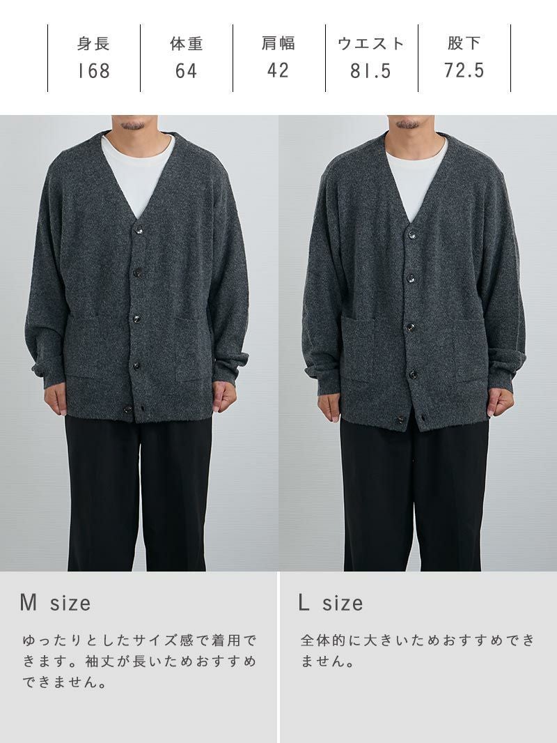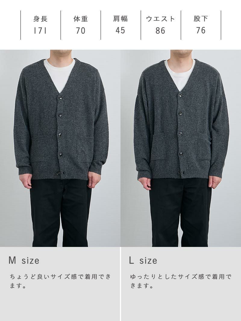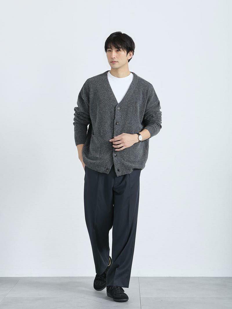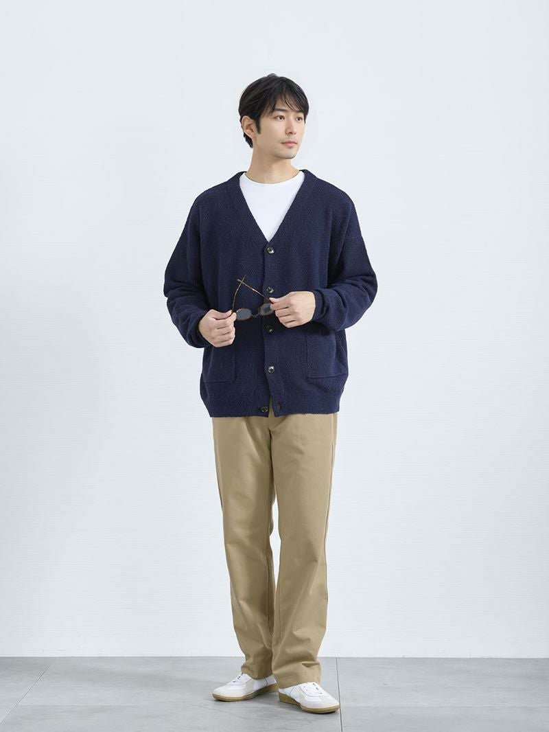 アイテム説明 カーディガンが苦手な人にも挑戦してほしいメランジカーディガン 開きすぎないVネックと高めの第一ボタンで上品さをキープ。 ドロップショルダーでリラックス感を持たせながらも、だらしなく見えない仕上がりです。 ふんわり軽いメランジニット 空気を含む編み地は軽量であたたかく、ふわっとした見た目が優しいイメージを与えます。 サイズ・素材 肩幅 身幅 袖丈 着丈 S 61 62.5 50.5 62.5 M 63 64.5 52 65 L 65.5 67 52.5 66 XL 68 70 53 69.5 ※表記サイズは実寸であり、個体差により誤差が生じる場合があります。 ※商品によっては洗濯タグにヌード寸法が記載されておりますが、実寸とは異なります。 伸縮性 あり ややあり なし 厚み 厚手 普通 薄手 透け感 あり ややあり なし 洗濯 洗濯OK ネット使用 手洗いのみ 表地 ポリエステル81%アクリル15%ポリウレタン4% 裏地 なし 生産国 中国 禁止事項 乾燥機使用×日向干し×漂白剤使用× 表示を隠す サイズにお悩みですか? AIに適正サイズを聞く 返品・交換は無料で安心 ご自宅でじっくりご試着いただけます。合わなければ送料負担なく返品できます。あなたにぴったりの一着と出会えるよう、お手伝いいたします。 コーディネート Model : 179㎝ / 66㎏ / L/ チャコール着用 ニットカ―デでもきちんと見えコーデ ゆったりとしたフォルムのカーディガンを、大人らしくすっきりと着こなすには、シンプルなカットソーがおすすめ。 オフィスにも使えるセンタープレス入りのパンツで、端正な印象をプラスして子供っぽさを払拭します。 CODEロングスリーブTシャツ CHECK CODEストレート ウールブレンド 通年用 CHECK スウェードレザースニーカー CHECK リバーシブルレザーベルト CHECK Model : 179㎝ / 66㎏ / L/ チャコール着用 男らしいカジュアルスタイル デニムを合わせたワイルドな印象に、起毛カーディガンのやわらかさが加わり、男らしさと優しさを両立。 モノトーンでまとめてクールに仕上げたこのスタイルは、デートや大人のカジュアルシーンにもぴったりです。 タウンユースマウンテンパーカー CHECK CODEロングスリーブTシャツ CHECK ストレートジーンズ CHECK リバーシブルレザーベルト CHECK Model : 179㎝ / 66㎏ / L/ ネイビー着用 快適に過ごせるオフィカジコーデ オフィスにも馴染む定番カラーは、程よいリラックス感ときちんと感を意識することが肝心。 明るめネイビーは、地味すぎず着こなしやすい一枚です。 合わせ方次第で幅広く使えるアイテムは、大人の強い味方です。 バンドカラーシャツ CHECK CODEテーパード ウィンター CHECK スウェードレザースニーカー CHECK リバーシブルレザーベルト CHECK Model : 179㎝ / 66㎏ / L/ ネイビー着用 秋の休日お出かけスタイル 快適な休日服の正解は、こんなチノパンスタイル。 ゆったりとしたカーディガンを合わせてリラックスした1日を過ごしたい。 ネイビーカラーは合わせる色を選ばない万能アイテムです。 CODEロングスリーブTシャツ CHECK テーパードチノパンツ CHECK コートレザースニーカー CHECK ボストンサングラス 調光レンズ CHECK スタッフコーディネート もっと見る