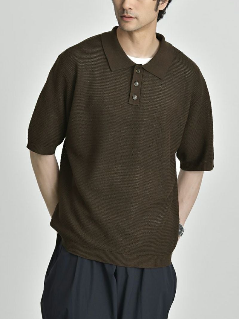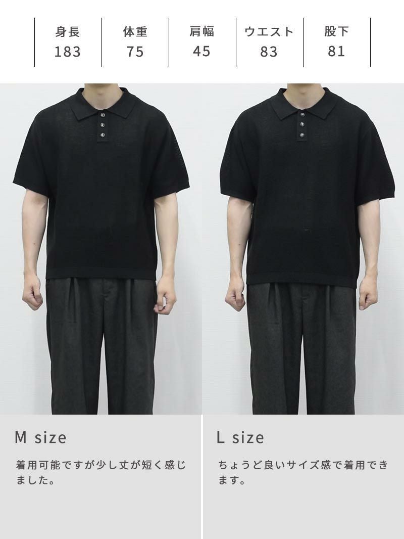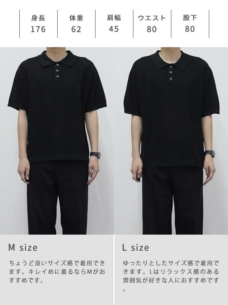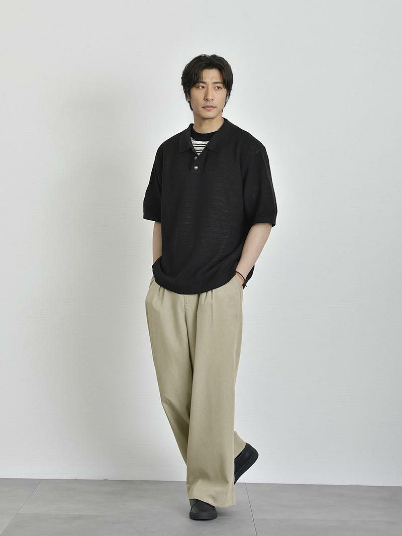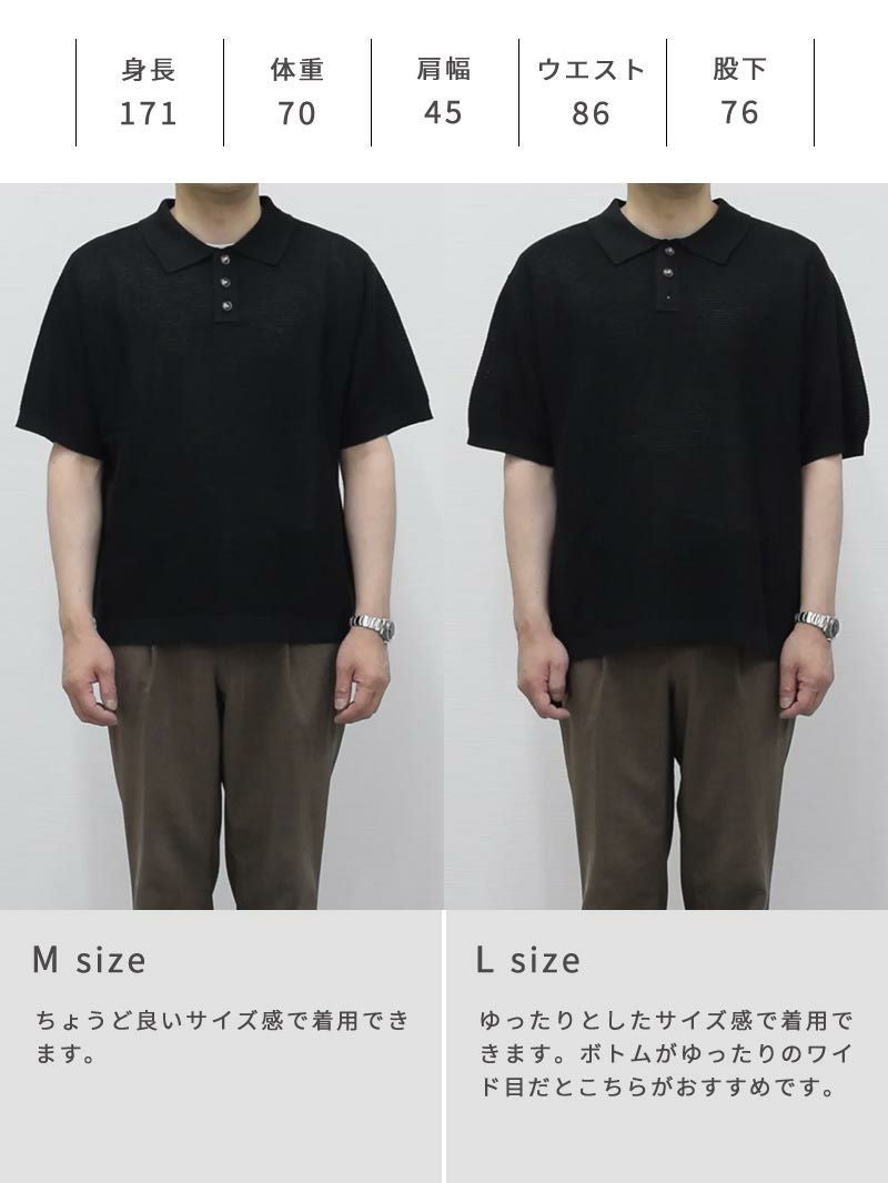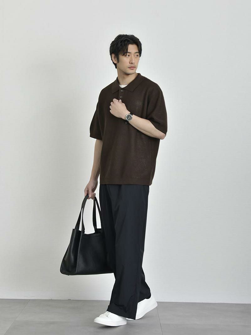 上品に着こなす夏のこなれポロ シアー感のある生地、そしてややルーズなシルエットは全体の抜け感と肩のラインや身幅に自然なゆとりを持たせ、一枚でこなれた印象に。 きちんと感のある襟元にあしらった存在感のあるボタンも程よいアクセントをプラス。 「麻のようなシャリ感」と 「合繊ならではの軽さ・扱いやすさ」を両立 まるで麻のような、さらっと肌離れのいいドライな質感。 実は高機能アクリル素材でできており、シワになりにくく、汗ばむ季節にも快適な通気性を発揮。軽くて型崩れしにくいのも嬉しいポイントです。 もっと見る ほどよく主張する編地になっているため、無地なのに地味に見えない絶妙なバランスがとれた生地です。 夏に最適な抜け感のあるシルエット ややルーズなゆったりシルエットが、こなれた抜け感を演出。 身体のラインを拾わず、自然に落ちる肩のラインと程よい身幅で、これからの季節に適したリラックス感のある印象をつくっています。 襟のボタンはやや存在感のあるボタンを使用し、コーディネートのアクセントとして役立ちます。 着回しやすい2色のカラー カラーは洗練されたブラックと、ほんのり赤みを含んだ柔らかいブラウンの2色をご用意。 デニムやスラックスといった幅広いボトムスと好相性。 シーンや気分に合わせて自在に着回せる、頼れる2色展開です。 当商品に合わせるおすすめのパンツ ドレッシーな印象のニットポロに、程よくゆとりあるワイドパンツを合わせれば都会的で余裕のある大人の装いに。 オフィスにも休日にも馴染む、品のあるリラックススタイルを。 落ち着いたブラウンと軽やかなアイボリーの組み合わせで、上品さと抜け感を両立。ゆったりとしたシルエットが、大人の余裕を感じさせる夏のリラックススタイル。 上品なニットの質感と、軽快なショーツのギャップで抜群のバランスに。カジュアルなのに子どもっぽく見えない、品のあるリゾートスタイル。 一緒におすすめ CODEセミワイドパンツ ルーズ CHECK タックワイドパンツ CHECK ツイルショートパンツ CHECK サイズ・素材 肩幅 身幅 袖丈 着丈 S 48.5 56 22 62.5 M 50 59 23.5 64 L 51 62.5 24 64.5 ※表記サイズは実寸であり、個体差により誤差が生じる場合があります。 ※商品によっては洗濯タグにヌード寸法が記載されておりますが、実寸とは異なります。 伸縮性 あり ややあり なし 厚み 厚手 普通 薄手 透け感 あり ややあり なし 洗濯 洗濯OK ネット使用 手洗いのみ 表地 アクリル100% 裏地 なし 生産国 中国 表示を隠す スタッフ試着レビュー サイズにお悩みですか? AIに適正サイズを聞く 返品・交換は無料で安心 ご自宅でじっくりご試着いただけます。合わなければ送料負担なく返品できます。あなたにぴったりの一着と出会えるよう、お手伝いいたします。 コーディネート Model : 179㎝/66㎏/ L / ブラック着用 程よく透け感のあるニットには、インナーは必須。くすみカーキのインナーを差すことで、ブラックのワントーンに抜けと深みをプラス。 首元からのさりげない肌見せが、品のある“静かな色気”を感じさせてくれます。 ストレッチレイヤードタンクトップ CHECK ナイロンストレッチパンツ[セットアップ対応] CHECK Salvatole Marra クロノグラフ腕時計 CHECK HARUSAKU 奈良産 バックラインソックス CHECK Model : 179㎝/66㎏/ L / ブラック着用 「大人のカジュアル感」を大切にしたい方に。 ボーダーのレイヤードでほどよいラフさをプラス。気取りすぎず、休日の家族時間やひとり時間にも◎ モックネックマルチボーダーTシャツ CHECK CODEワイド サマー CHECK 日本製 コンチョ付きブレスレット CHECK スマートスニーカー CHECK Model : 179㎝/66㎏/ L / ブラウン着用 ブラウンには、インナーに白を合わせるとグッと清潔感のある印象に。 ボトムスはチャコールのワイドパンツを合わせて、リッチにしあげればトレンド感のある大人コーデの完成。 ストレッチレイヤードタンクトップ CHECK CODEワイド サマー CHECK シンセティックレザーミニショルダーバッグ CHECK シルバー925 デザインバングル CHECK Model : 179㎝/66㎏/ L / ブラウン着用 夏のオフィスコーデには、インナーに白のTシャツをいれて、露出は控えめに。ボトムスはスラックスでキレイめ感をだせば、きちんと感のある印象に。 クールタッチスムースTシャツ CHECK ナイロンストレッチパンツ[セットアップ対応] CHECK 2wayマルチトートバッグ CHECK スマートスニーカー CHECK スタッフコーディネート もっと見る