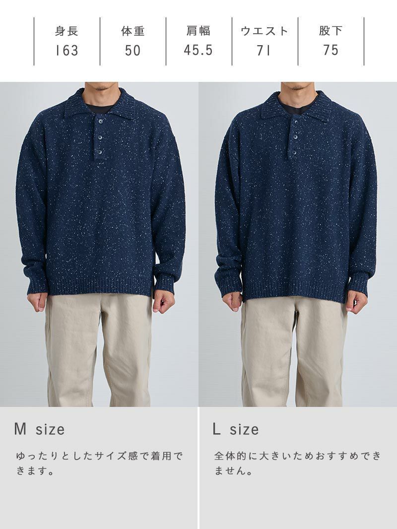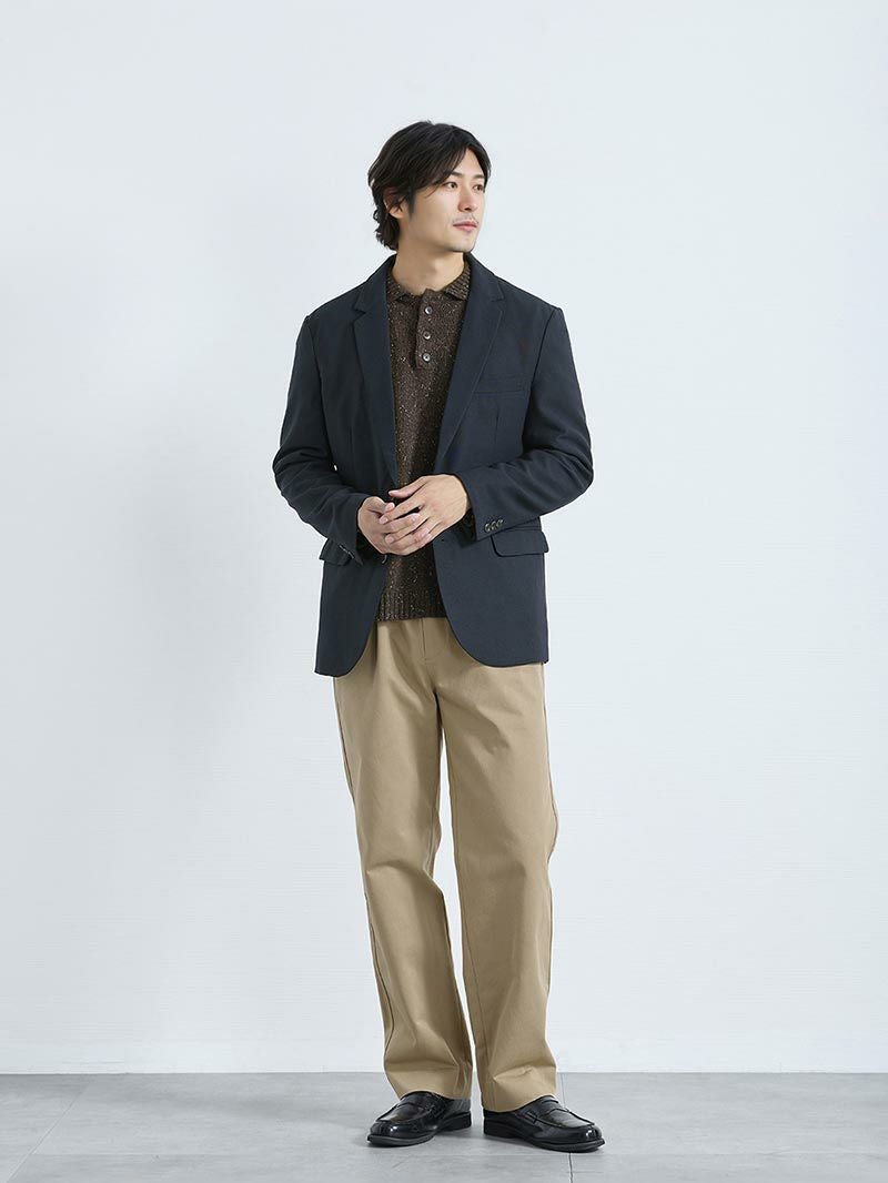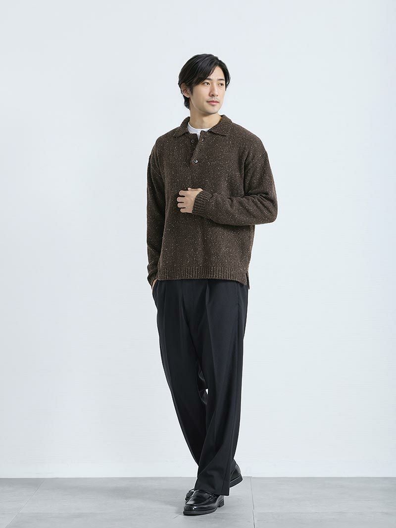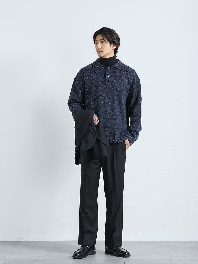 アイテム説明 生地で遊んで、襟で整えるニットポロ ネイビーとブラウンに上品で、派手すぎない白のネップ(糸の節)。 襟付きのポロ型は顔まわりをキリッと、ボタンをひとつ外せば抜け感も足せる。 ウール混の保温・吸湿で快適 糸の段階で柔軟仕上げだから長時間でもチクチク知らず。 一枚で主役になれるディテール ほどよいバルーンシルエットに袖・裾リブ、サイドスリット。 後ろ丈がやや長めでストンと落ちるきれいなシルエット。 スラックスとの相性抜群 CODEパンツと合わせるだけで“きまる”ネップポロニット。 自宅で洗えて毛玉も出にくいです。 おすすめのボトムス CODEテーパード CHECK CODEテーパード ウィンター CHECK LIGHT TECHインナーとは、太陽光・室内灯の近赤外線と、身体から放射される遠赤外線を熱に変える発熱素材を使用した機能性インナーです。 着心地の良い裏起毛によって、より暖かさアップ。 また、ネックラインと袖の長さにこだわり、襟元・袖口からインナーが見えないように設計。 ニット・シャツなど、どんなトップスにも合わせることができます。 好みで選べる2タイプ首元まで暖かいクルーネックシャツと好相性のVネック LIGHT TECH クルーネックインナーTシャツ CHECK LIGHT TECH VネックインナーTシャツ CHECK サイズ・素材 肩幅 身幅 袖丈 着丈 M 53.5 57 57 65.5 L 56.5 59.5 58.5 67.5 XL 57.5 61.5 59.5 70.5 ※表記サイズは実寸であり、個体差により誤差が生じる場合があります。 ※商品によっては洗濯タグにヌード寸法が記載されておりますが、実寸とは異なります。 伸縮性 あり ややあり なし 厚み 厚手 普通 薄手 透け感 あり ややあり なし 洗濯 洗濯OK ネット使用 手洗いのみ 表地 アクリル60%%ポリエステル27%ウール13% 裏地 なし 生産国 中国 禁止事項 乾燥機使用×漂白剤使用× 表示を隠す サイズにお悩みですか? AIに適正サイズを聞く 返品・交換は無料で安心 ご自宅でじっくりご試着いただけます。合わなければ送料負担なく返品できます。あなたにぴったりの一着と出会えるよう、お手伝いいたします。 コーディネート Model : 179㎝ / 66㎏ / L/ ネイビー着用 ブラックでまとめてクールにきめる ブラックのコーデにネイビーのニットをプラスすることで一気に小慣れた印象に格上げできるコーディネート。 ジャケットを脱いだ時にも普通っぽくならない着こなしに仕上がります。 CODEテーラードジャケット ウールブレンド 通年用 CHECK ハイゲージシルクタートルニット CHECK CODEストレート ウールブレンド 通年用 CHECK Model : 179㎝ / 66㎏ / L/ ネイビー着用 爽やかに仕上げるカジュアルコーデ ネイビーワントーンでまとめるときに効果を発揮するのが表情豊かなニットです。 ポロカラーのきちんと感とネップツイードのソフトな風合いで、好印象間違いなしの着こなしに仕上げましょう。 CODEロングスリーブTシャツ CHECK テーパードチノパンツ CHECK スウェードレザースニーカー CHECK Model : 179㎝ / 66㎏ / L/ ブラウン着用 ジャケパンのトラッドな着こなし トラッドな印象をあえて強めに出したネイビージャケットの着こなし。 アクセントにはこんな表情のあるニットを選べば、ちょうどいい肩の力の抜けた着こなしが完成します。 CODEジャケット【2025年モデル】 CHECK テーパードチノパンツ CHECK Model : 179㎝ / 66㎏ / L/ ブラウン着用 トラッドに着こなすニットポロコーデ ポロカラーニットのトラッドさに、今どき感を意識した着こなしなら、インナーにカットソーをプラス。 ニットを1サイズアップし、トップスにボリュームを持たせれば、さらにトレンド感を強めに着こなせます。 CODEロングスリーブTシャツ CHECK CODEストレート CHECK スタッフコーディネート もっと見る